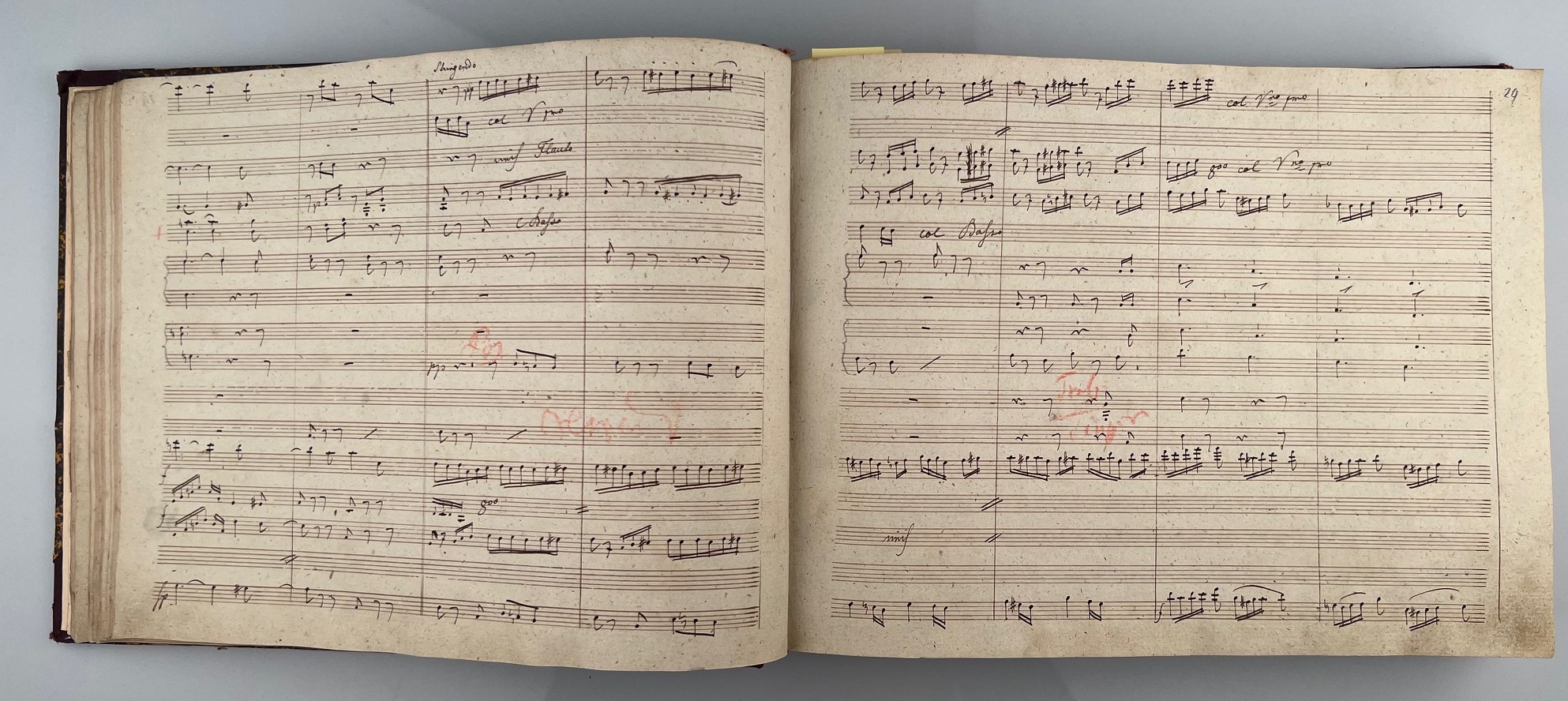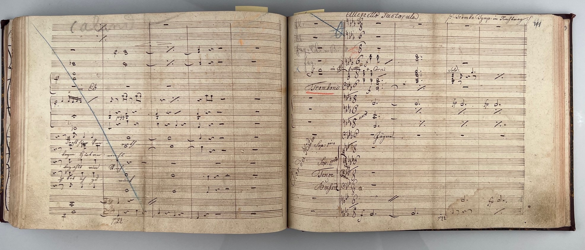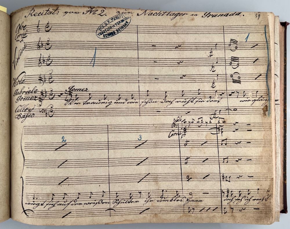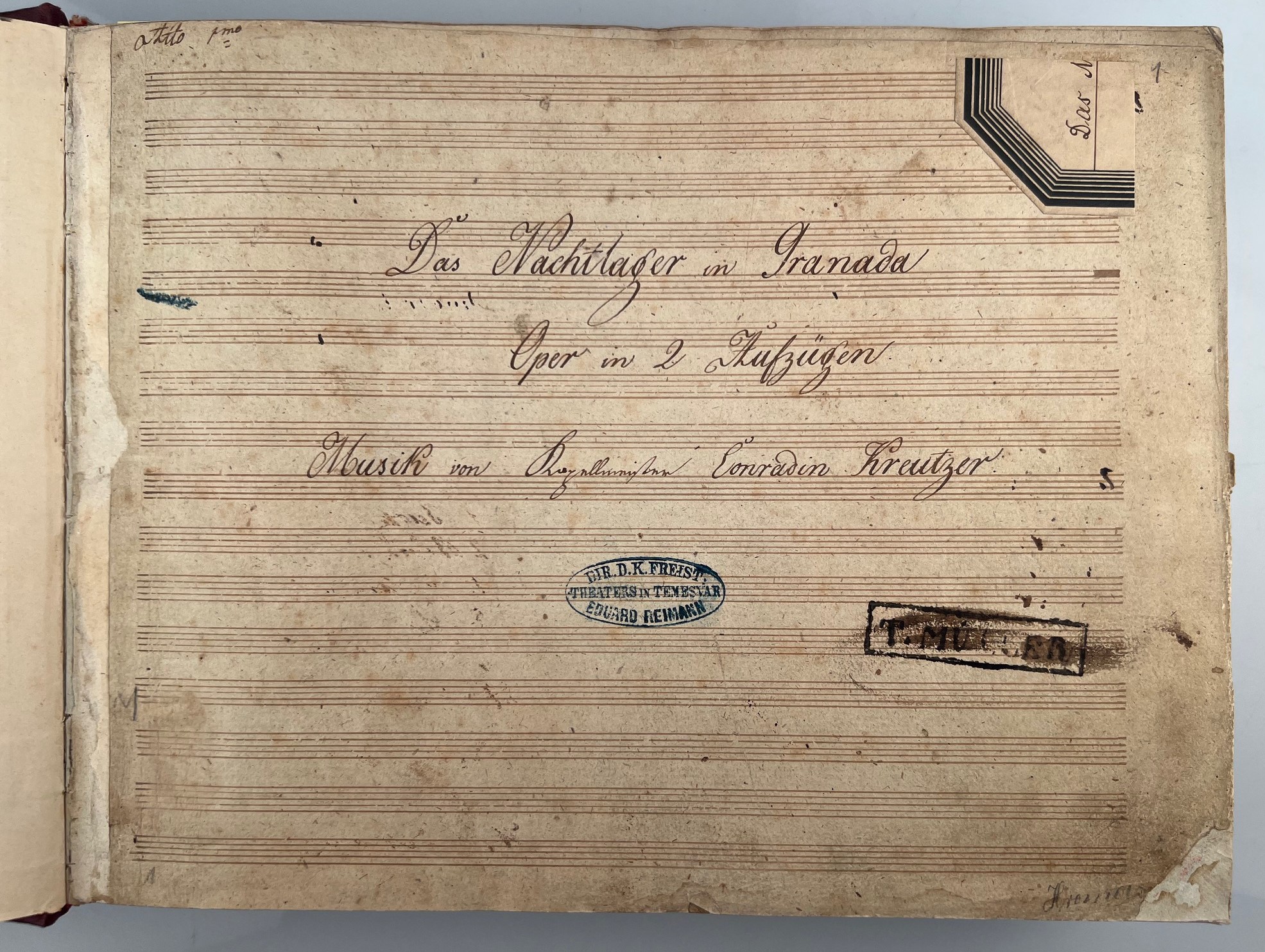 KREUTZER, CONRADIN [1780-1849]: Music manuscript "Das Nachtlager in Granada. Oper in 2 Aufzügen. Musik von Kapellmeister Conradin Kreutzer" [Full Score act 1 of 2]. No place, no date Quarto oblong. 253 leaves with 16 stave music paper. Lightly browned and a bit fingerstained, lower corner of title page reinforced. some leaves a bit tightly trimmed with insignificant loss of text of headings, but no loss of music. With auxiliary inscriptions by a conductor in blue and red crayon. Title and a few leaves stamped. Half cloth in contemporary style.