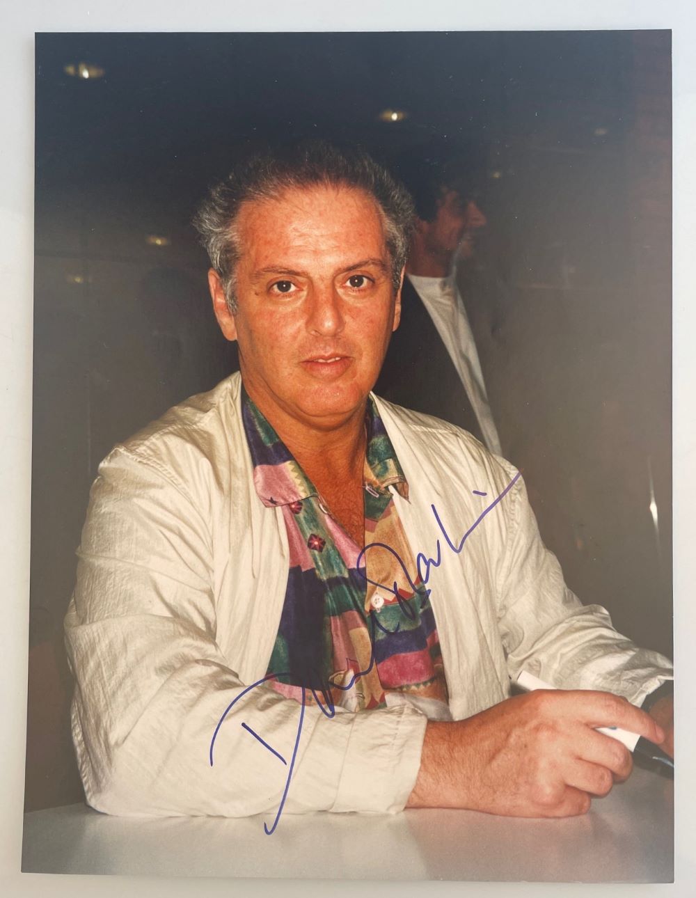 LARGE PORTRAIT PHOTO - presumably taken during a book signing. Daniel Barenboim, the famous Israelite conductor and pianist, is sitting at a table in casual clothes and holding a pen in his right hand.