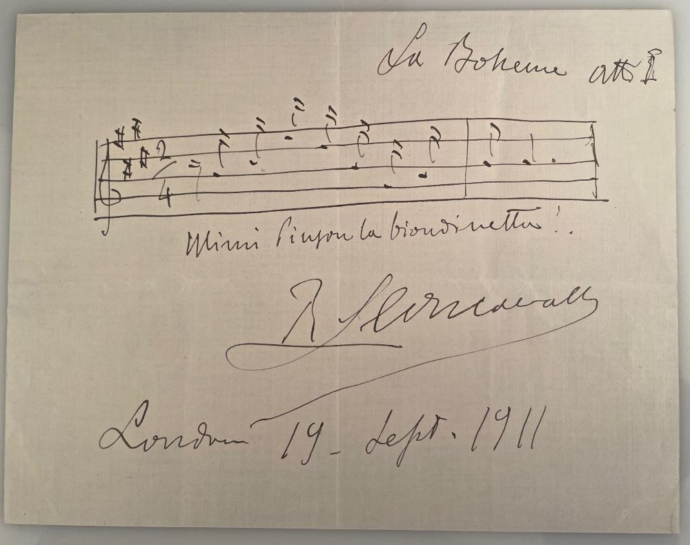 From his opera "La Bohème", with which Leoncavallo had challenged his most dangerous rival Puccini in 1897, a two-act phrase on "Mimi la biondinetta" (Act 1). Leoncavallo wrote this album leaf when he was in London and conducted a series of performances of his opera "Pagliacci" (The Bajazzo) at the London Hippodrome.
