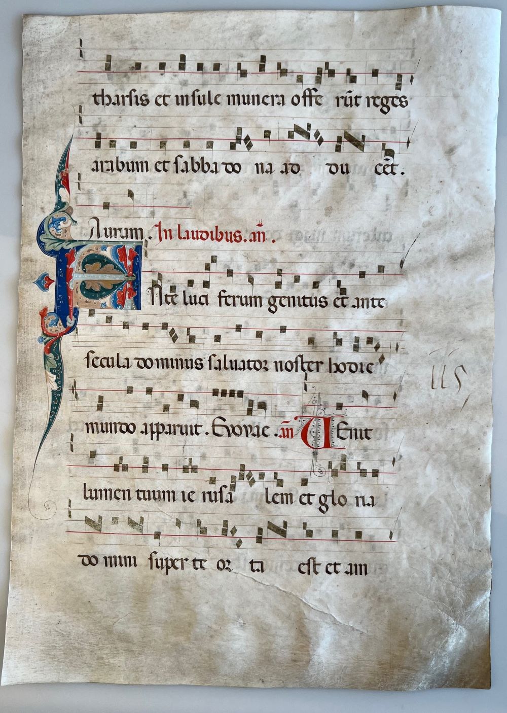 MEDIEVAL MUSIC MANUSCRIPT - MITTELALTERLICHE NOTENHANDSCHRIFT - NEUMES - HUFNAGEL - QUADRAT - NOTEN: Medieval manuscript - Antiphonar on vellum with illuminated initials, Italy end of 14th century. Folio 50,5 x 36 cm, vellum leaf inscribed and illuminated on both sides.