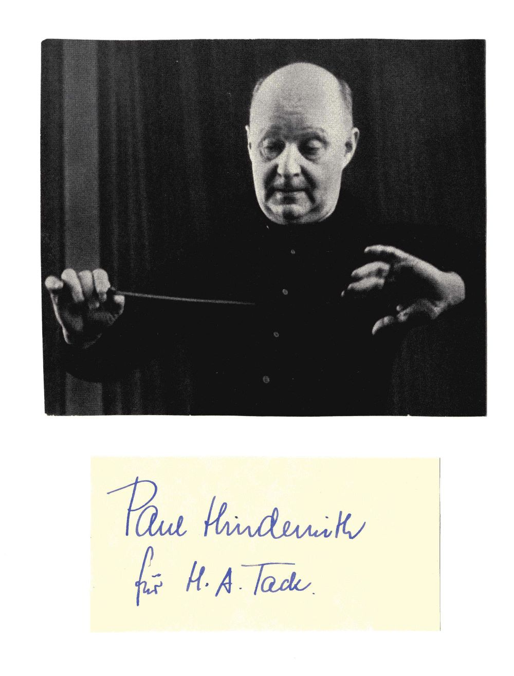 HINDEMITH, Paul [1895-1963]: Porträt-Fotografie mit beigegebener Unterschrift zusammen auf Karton montiert. - Portrait photograph with attached signature mounted together on cardboard. No place no date Ca. 1950 12,8 x 15,2 cm (Foto) und 6,0 x 11, 9 cm signature.