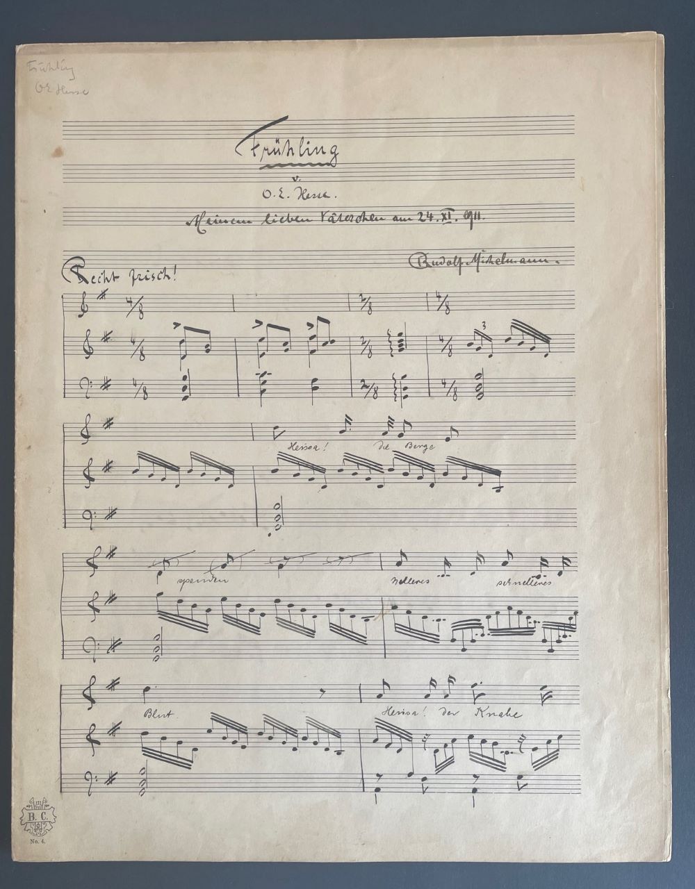 NICHELMANN, Rudolf: "Frühling - von O. E. Hesse. Meinem lieben Väterchen am 24.XI.1911". [Für Singstimme und Klavierbegleitung]. [Manuskript (Autograph?)]. Reinschrift in Tinte. Folio. 3 S. Etwas unfrisch.