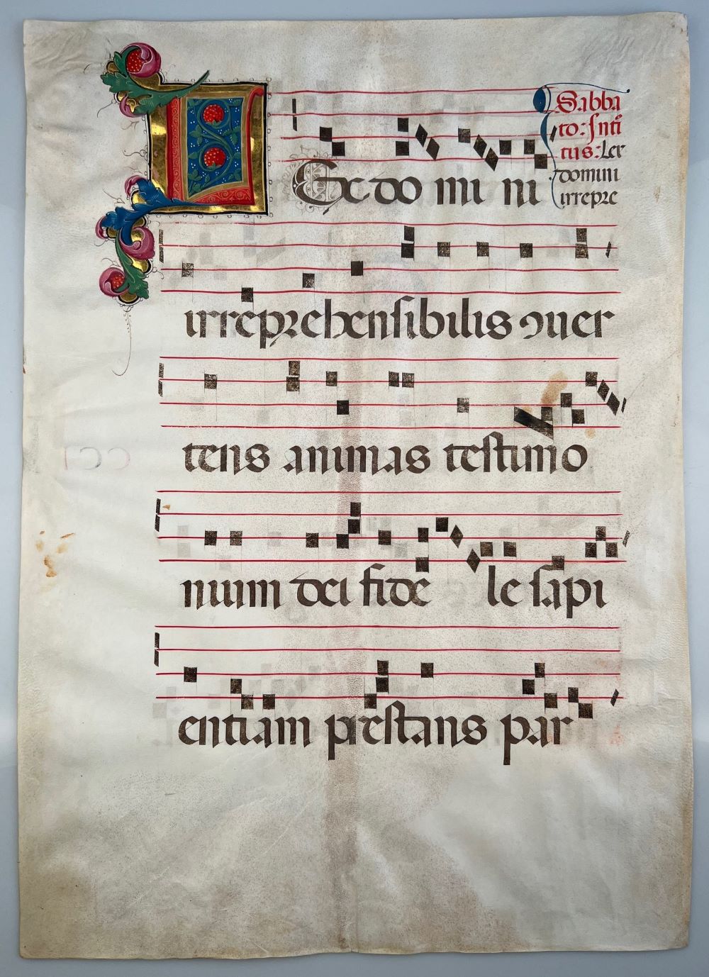 MEDIEVAL MUSIC MANUSCRIPT - MITTELALTERLICHE NOTENHANDSCHRIFT - NEUMES - HUFNAGEL - QUADRAT - NOTEN: Medieval manuscript Graduale on vellum inscribed on both sides and illustrated with two minatures. Northern Italy around 1500 Folio 56 x 40 cm. In total 10 staves and two miniatures on vellum.