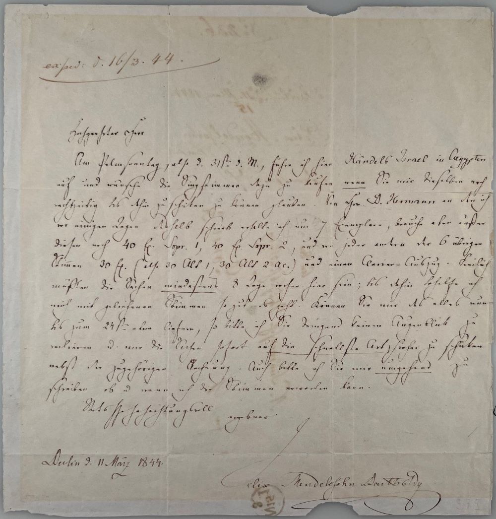 Mendelssohn's express order for further voices reads in excerpts as follows: "On Palm Sunday, i.e., the 31st of this month ... I will perform Handel's 'Israel in Egypt' [oratorio in 3 acts] here and wish to buy the vocal parts for it if you send them to me in time ... in time... but need ... 40 copies of Sopr. 1, 40 copies of Sopr. 2, and 30 copies of each of the 6 remaining parts ... and a clavier excerpt. ... Of course, the things would have to be here at least 8 days before; until then, I will make do with borrowed parts as best I can. If you can deliver all of this to me by the 24th, then I urgently ask you not to lose a moment and to send me the things immediately in the fastest way possible, along with the corresponding invoice. ...". - Only partially published in FMB Sämtliche Briefe, vol. 10, no. 4338.