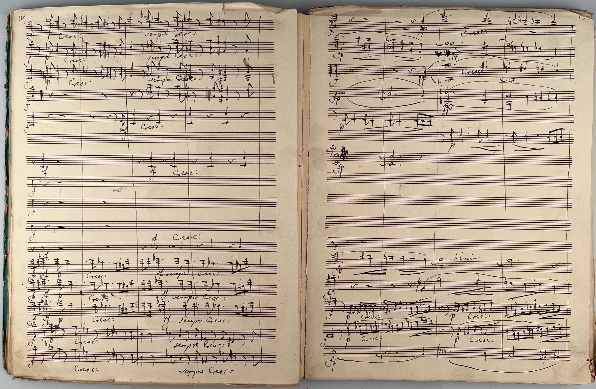 JOACHIM, Joseph [1831-1907]: Hamlet=Ouverture. Den Mitgliedern der Weimarschen Kapelle gewidmet von Joseph Joachim. Op. 4. manuscript of scribe's hand, corrected and supplemented by the hand of the composer. - Manuskript von Schreiberhand, eigenhändig von Joachim korrigiert und ergänzt. [Hannover 1853] Folio. 102 pp. with 16-line music paper. Turquoise paperback of the period with title label in the author's own hand. With traces of use.