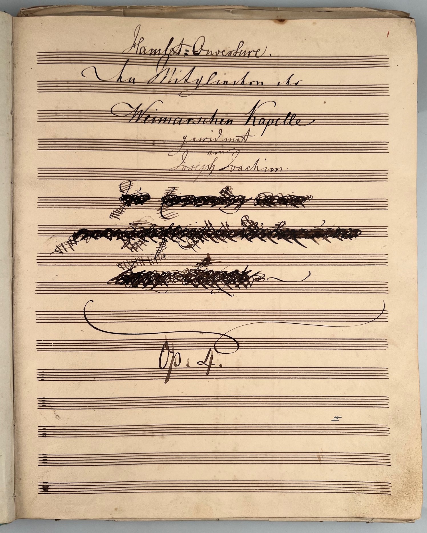 The present copy was probably made from Joachim's original manuscript of the Hamlet Overture, dated March 16, 1853, which is in the archives of the Gesellschaft der Musikfreunde in Vienna. Presumably this copy was made as early as March 1853 and was also sent to Franz Liszt on March 21.