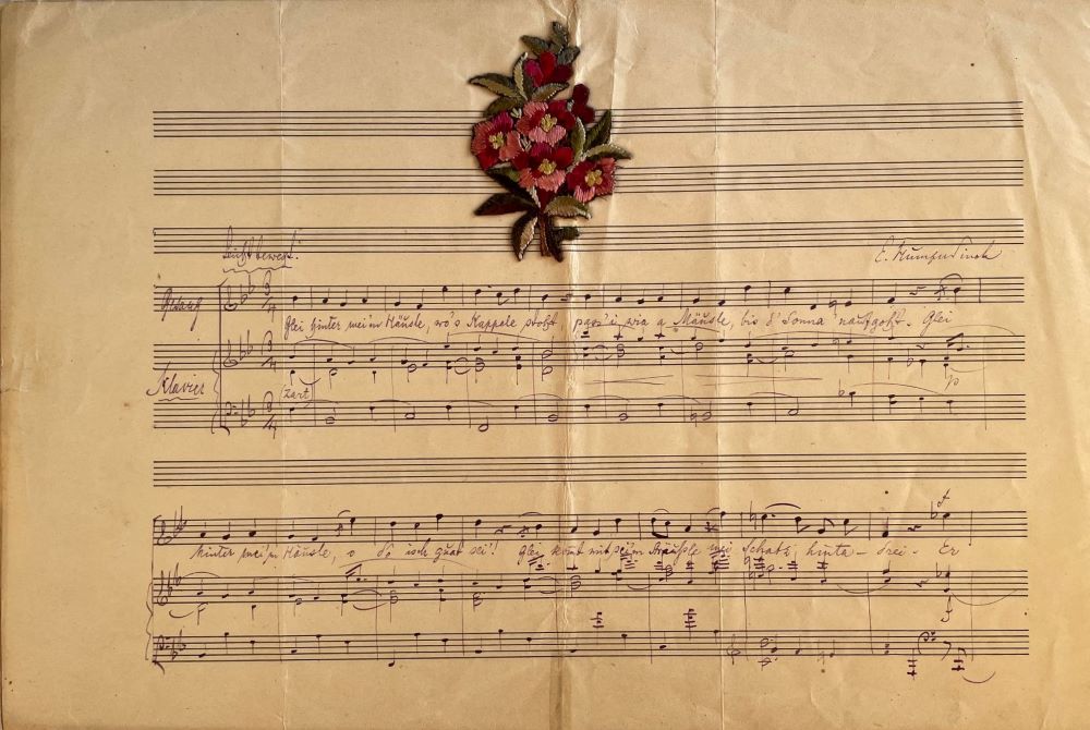 HUMPERDINCK, Engelbert [1854-1921]: " 's Sträussle. Schwäbisches Volkslied für eine Singstimme mit Klavierbegleitung". Autograph album leaf with title, dedication and signature on the first leaf. Dated at the end. [EHWV no. 92]. Bonn Weihnachten 1890 Quarto oblong 18 x 26.8 cm. Double sheet, 10-staves, 34 bars on 3 pages. With colored embroidered "Blumensträussle" (flowerbouquet), mounted at the beginning of the composition: "Drei Rösle im Sträußle für Mäxle sei'm Mäusle". Small inconspicuous tears, neatly backed, light creases, somewhat browned.