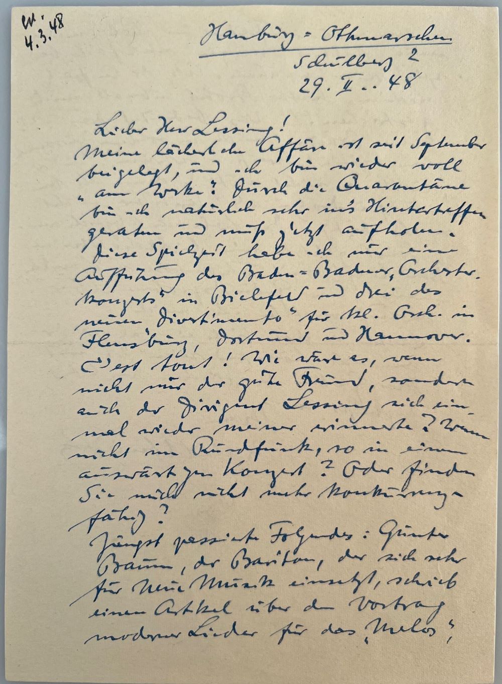 "MY RIDICULOUS AFFAIR IS RESOLVED" - An Gotthold Ephraim Lessing, damals Chefdirigent des Südwestfunk-Sinfonieorchesters. Inhaltsreicher Brief des Hamburger Musikschriftstellers ("Die Zeit") und Komponisten, der vor allem durch seine Brahms- und Pfitzner-Monographien bekannt geworden ist, über musikpolitische Fragen der Nachkriegszeit: "Als der Aufsatz (in "Melos'') erschien, hatte Strobel überall mich gestrichen!!! Was bedeutet das??? ...". - To Gotthold Ephraim Lessing, then chief conductor of the Südwestfunk Symphony Orchestra. Content-rich letter from the Hamburg music writer ("Die Zeit") and composer, who became known primarily for his Brahms and Pfitzner monographs, about music-political issues of the postwar period: "When the essay (in "Melos'') appeared, Strobel had cancelled me everywhere!!!. What does that mean??? ...".