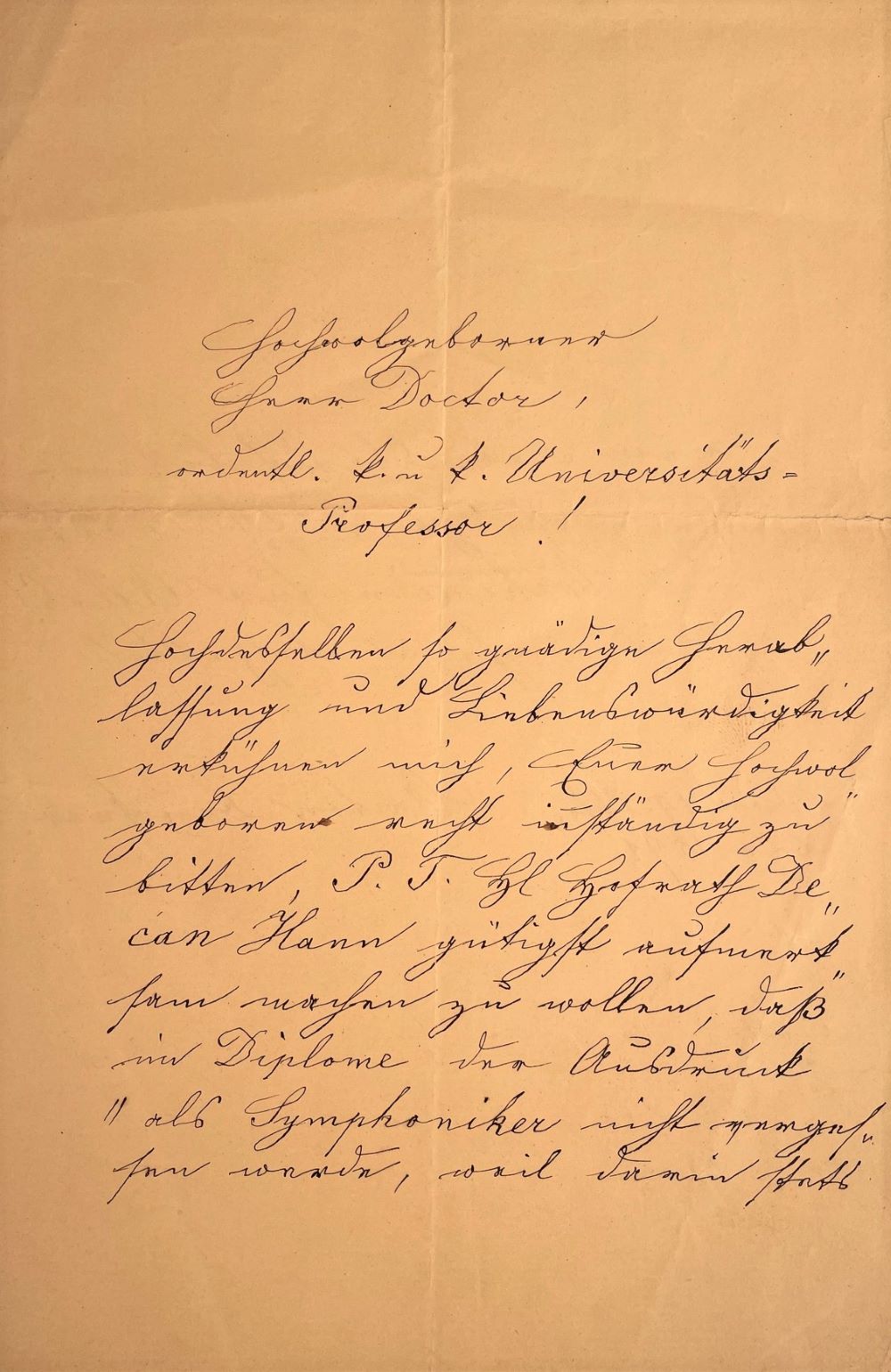 In receiving an honorary doctorate, Bruckner received an honor that he felt was the greatest of his life! "The University of Vienna appointed him.... on July 4, 1891, unanimously to an honorary doctorate. It was the first time that this dignity was conferred on a musician by the University of Vienna. For Bruckner this act meant the fulfillment of a heart's desire... and a demonstration against the Hanslick-Brahms party, which thought that it alone owned the art of music. (Max Auer, Anton Bruckner, Sein Leben und Werk, 6th ed., p. 454). Simon Leo Reinisch, Egyptologist and Dean of the University of Vienna, to whom the present letter is addressed, had inquired with Levi in June 1891 about the planned conferral of an honorary doctorate and received the following reply from Levi in Bayreuth, dated 23.6.91: "... that I can only describe the honor bestowed on Professor Bruckner as a most deserved one. In my opinion, Bruckner is by far the most important symphonist of the post-Beethoven period." (Bruckner, ext. cat. of the Austrian National Library, Vienna 1974, no. 58/4).
