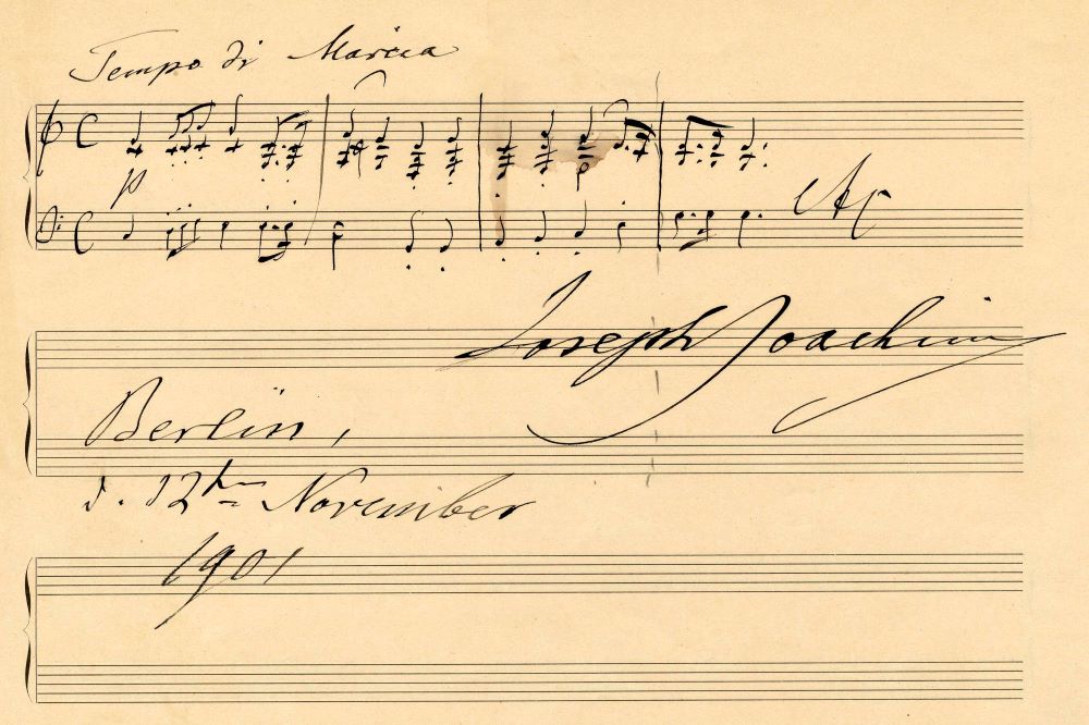 4 1/2 measures in C major, titled "Tempo di Marcia" notated for piano. - Joachim was considered one of the most important violin virtuosos in the 2nd half of the 19th century. He was in close contact with the most important composers of his time such as: Mendelssohn, Liszt, Schumann, Brahms, M. Bruch and Dvorak. - 4 1/2 Takte in C-Dur, überschrieben "Tempo di Marcia" für Klavier notiert. - Joachim galt als einer der bedeutendsten Geigenvirtuosen in der 2. Hälfte des 19. Jahrhunderts. Er stand im engen Kontakt mit den wichtigsten Komponisten seiner Zeit wie: Mendelssohn, Liszt, Schumann, Brahms, M. Bruch und Dvorak.
