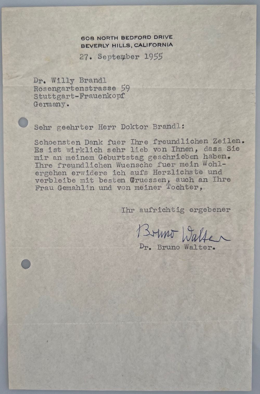 WALTER, Bruno [1876-1962]: Brief in Maschinenschrift mit Ort, Datum und eigenhändiger Unterschrift. - Letter in typescript with place, date and autograph signature. Beverly Hills "27. September 1955". Octavo 21 x 14cm, punched.