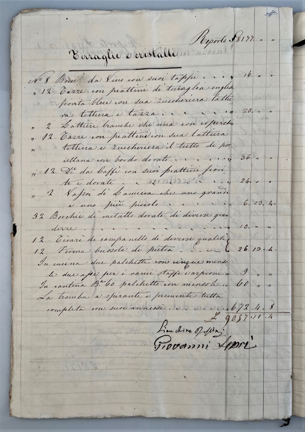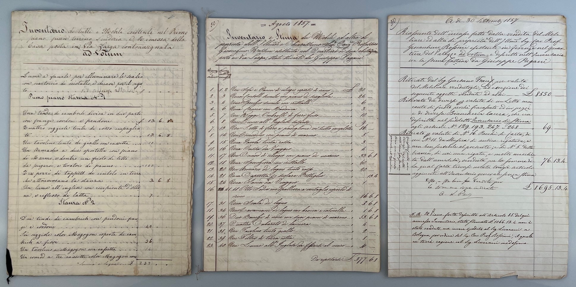 Die vorliegenden 3 Dokumente beziehen sich auf eines seiner Häuser in der Via Larga (heute Via Cavour). Das erste von Rossini unterschriebene Dokument umfasst eine nicht datierte Auflistung und Wertermittlung von 168 Einrichtungsgegenständen, wie Tische Stühle, Schränke, Vasen, Teppiche, Uhren, Kerzenständer, Geschirr, Prozellan etc. mit einem summierten Wert von 9.057 Lira. Die zweite Liste umfasst eine Auflistung erstellt im August 1857 mit Wertschätzungen von Giuseppe Pagani mit einer Summe von 9.701 Lira und das dritte Dokument ist eine Zusammenfassung der Erlöse aus dem Verkauf des Mobilars für 8.695 Lira, datiert 30.9.1857.