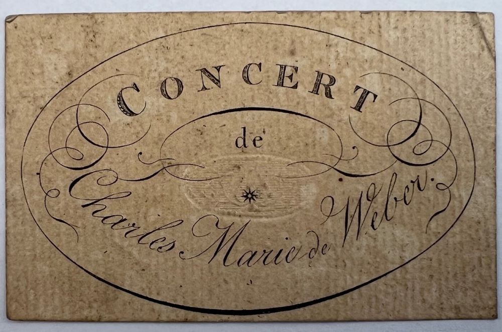 WEBER, Carl Maria von [1786-1826]: Printed entrance ticket: "Concert de Charles Marie de Weber" with Weber's autograph signature "CMv Weber" on the backside. Ohne Ort und Datum [Um 1810]. 5,3 x 8,4 cm. Lightly browned. With ornamental blind embossing in the center.