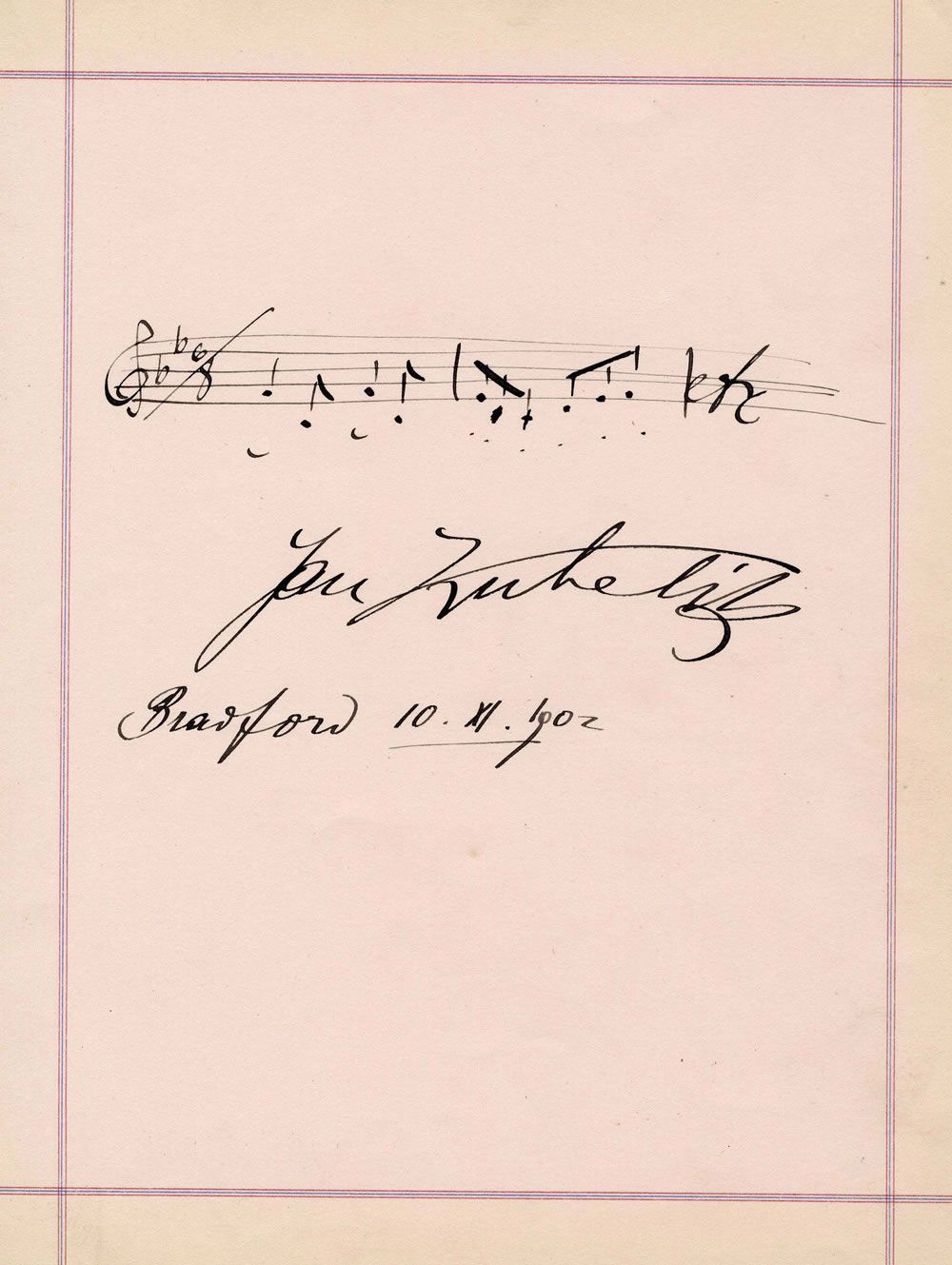 ATTRACTIVE ALBUM LEAF with two bars in B-flat major, written down during a concert tour in England. Kubelik, Czech violinist and composer, was celebrated as the "Second Paganini," among others.