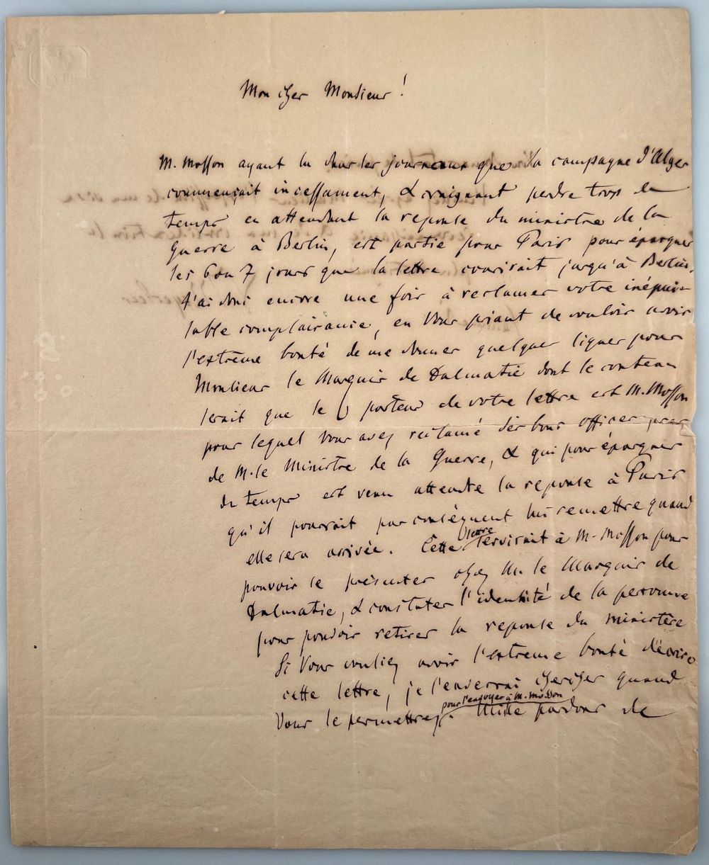 In diesem Brief bittet Meyerbeer einen Herrn in Paris darum, ein Empfehlungsschreiben an Marquis de Dalmatie für seinen Vetter und Schwager Adolph Mosson zu richten, der sich schon auf dem Weg nach Paris befindet, um in Algerien am Feldzug teilzunehmen.