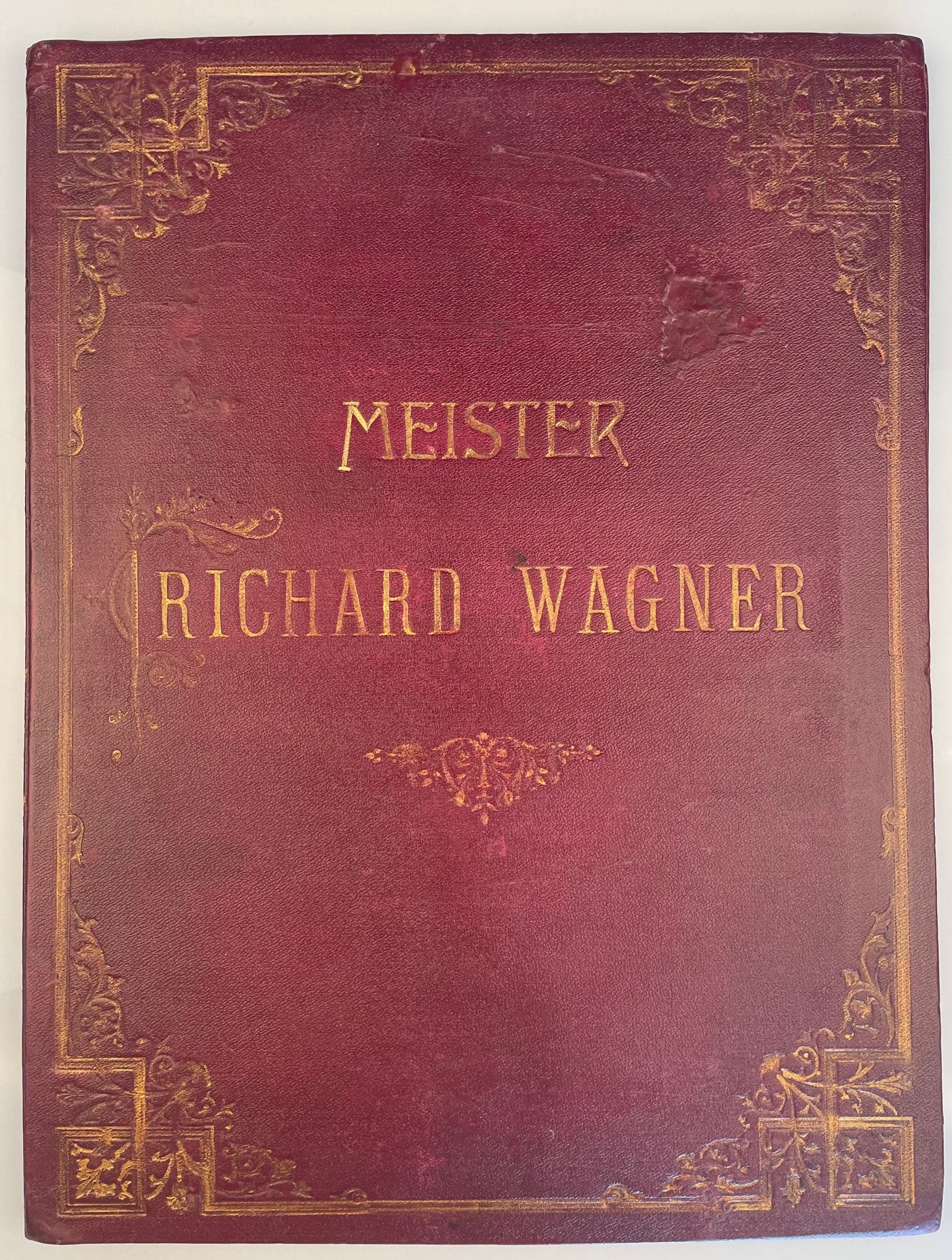 WAGNER, Richard [1813-1883]: Portrait, Porträt, Brustbild. Lithographie mit eigenhändiger Widmung - autograph dedication "Herr Rudolph Meunier kann mehr wie ich, Bayreuth, 26 Dezember 1880". Lithographie: Turin, Lith. F[rate]lli Doyen [um 1870]. Quarto 19 x 15cm. Widmung braunfleckig. In hochwertiger Präsentationsmappe der Zeit Einband aus rotem Leder mit reicher floraler Verzierung und Beschriftung "Meister Richard Wagner", beides in Goldprägung. Innen mit Seide ausgekleidet mit Messingplatte "Geschenk Richard Wagner's" unter der auf der linken Seite einmontierten Lithographie und Widmung, auf der anderen Seite in den Seidenbezug einmontiertes Porträtfoto, vermutlich Rudolph Meunier. - Mappe etwas beschabt und mit einigen kleinen fachgerecht restaurierten unauffälligen Fehlstellen.