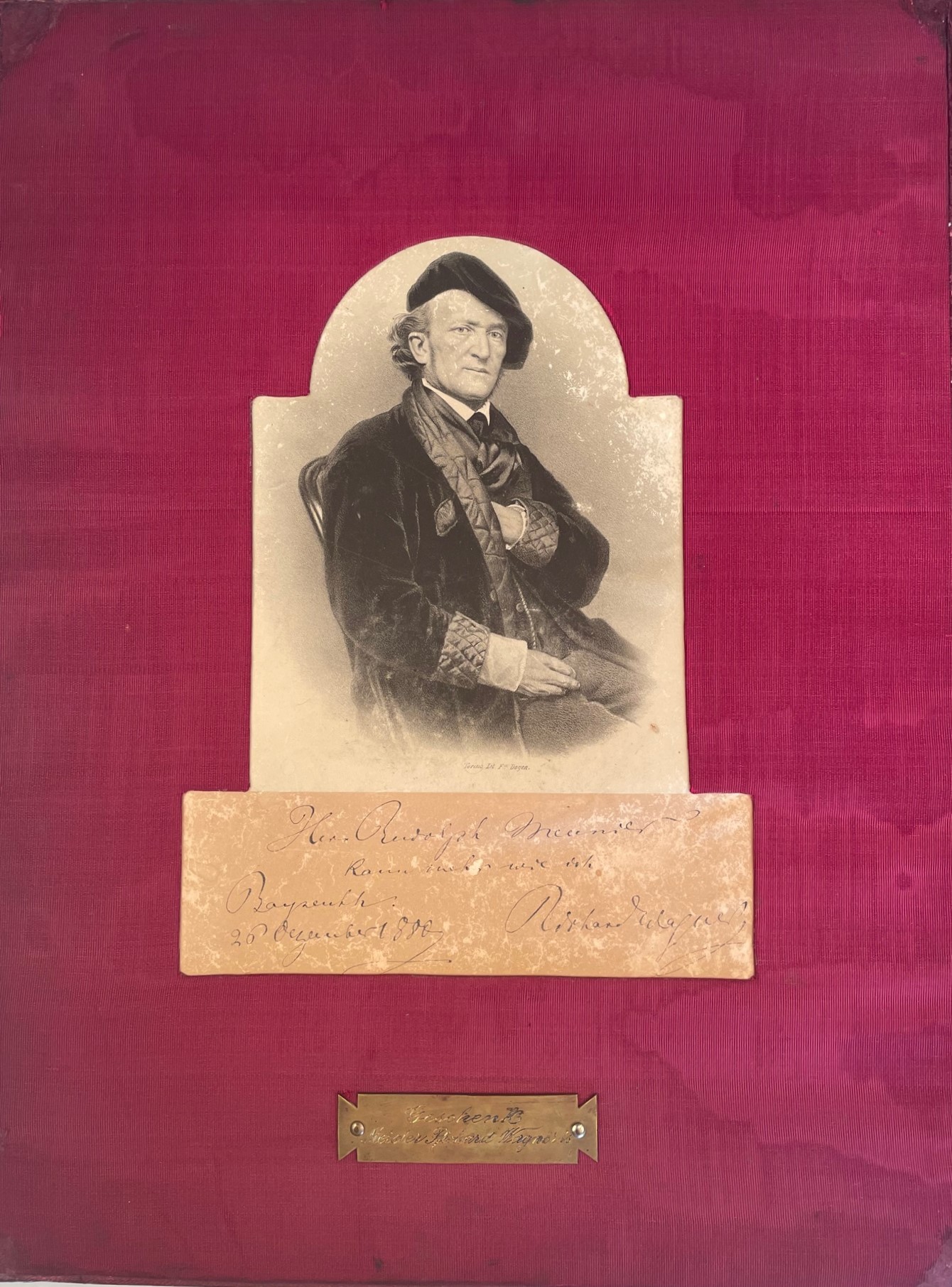 Wagner and the Magician - a curious document - In December 1880, Wagner met a magician (sleight-of-hand player) in Bayreuth who impressed him so much that he gave him his lithographed portrait with a very special dedication. "On one of the following days, it gave him pleasure to see a sleight-of-hand player, who had just produced himself in Bayreuth, show his arts in a private performance at Wahnfried for the amusement of an invited crowd of children. The skillful man surpassed himself under these circumstances, and Wagner gave him his portrait as a memento with the signature: 'Herr Meunier can do more than I.'" (Glasenapp: The Life of Richard Wagner', vol. 6, p. 421). This encounter with the sleight of hand must have been such a special and curious event that Cosima, Wagner's wife, recorded it in her diary entry of December 27, 1880, as follows: "... in the evening he and we and a crowd of children are entertained in the hall by the sleight of hand, whose skill is really striking. R. gives him his picture and writes under it: 'Herr Mennier (sic!) can do more than I.'" (C. Wagner, Diaries, vol. 3, p. 648). Meunier must have been so enthusiastic and impressed by this gift and the appreciation of the great master that he had a high-quality presentation folder made of leather for the lithograph with the dedication, in which he had the valuable gift mounted, in memory together with his photograph on the opposite page. The illustration of Wagner is a lithograph made in reverse after a photograph taken by Pierre-Louis Pierson in Paris in 1867. - On Pierson cf: Bory 166; Geck 20 C; Vanselow 19. Wagner und der Taschenspieler - ein kurioses Dokument. Wagner traf im Dezember 1880 in Bayreuth einen Taschenspieler, der ihn so beeindruckte, dass er ihm sein lithographiertes Porträt mit einer ganz besonderen Widmung schenkte. "An einem der folgenden Tage machte es ihm Vergnügen, einen soeben in Bayreuth sich produzierenden Taschenspieler zur Ergötzung einer eingeladenen Kinderschar seine Künste in einer Privatvorstellung in Wahnfried zeigen zu sehen. Der geschickte Mann übertraf unter diesen Umständen sich selbst, und Wagner schenkte ihm zur Erinnerung sein Portrait mit der Unterschrift: 'Herr Meunier kann mehr als ich.'"(Glasenapp: Das Leben Richard Wagners', Bd. 6, S. 421). Dieses Zusammentreffen mit dem Taschenspieler muss ein so besonderes und kurioses Ereignis gewesen sein, dass Cosima, Wagners Ehefrau, dies in ihrem Tagebucheintrag vom 27. Dezember 1880 wie folgt festhielt: "... abends ergötzt ihn und uns und eine Schar Kinder in der Halle der Taschenspieler, dessen Geschicklichkeit wirklich auffallend ist. R. schenkt ihm sein Bild und schreibt darunter: 'Herr Mennier (sic!) kann mehr als ich.'" (C. Wagner, Tagebücher, Bd. 3, S. 648). Meunier muss von diesem Geschenk und der Würdigung des großen Meisters so begeistert und beeindruckt gewesen sein, dass er für die Lithographie mit der Widmung eine hochwertige Präsentationsmappe aus Leder anfertigen ließ, in der er das wertvolle Geschenk einmontieren ließ, in Erinnerung zusammen mit seinem Foto auf der gegenüberliegenden Seite. Bei der Abbildung Wagners handelt es sich um eine Lithographie, die in seitenverkehrter Darstellung nach einer von Pierre-Louis Pierson 1867 in Paris aufgenommenen Fotografie erstellt wurde. - Zu Pierson vgl.: Bory 166; Geck 20 C; Vanselow 19