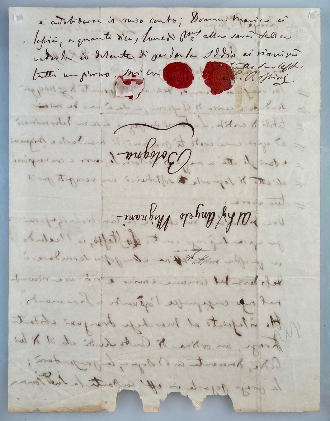 ROSSINI, Gioachino [1792-1868]: Autograph letter with place, date and signature. Firenze 8. Juni [1850] Quarto. 1,5 pages. Folded and with well remainded seals. Angelo Mignani in Bologna. Mit Siegelresten.