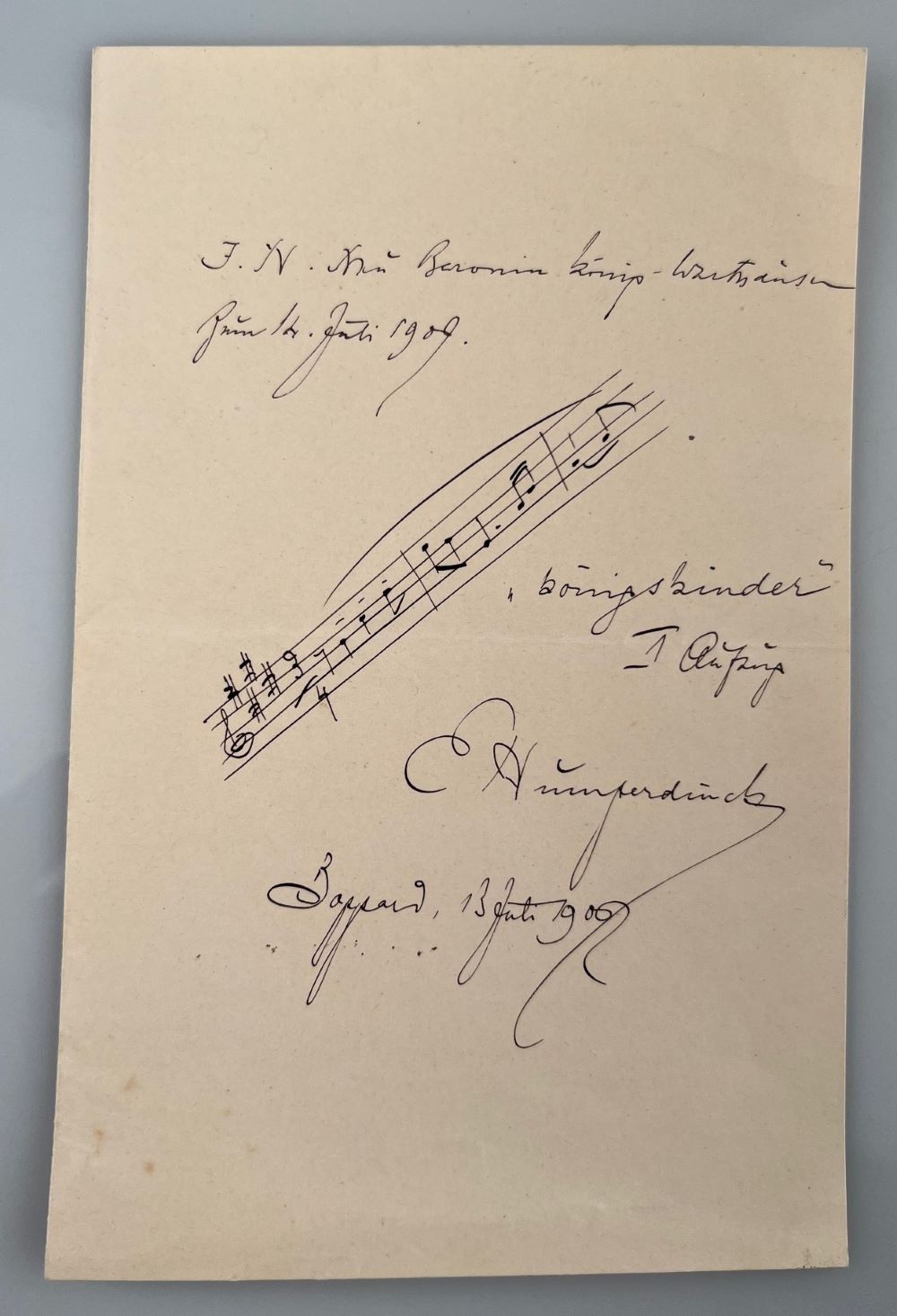 Three bars from his famous fairy-tale opera "Königskinder," 1st act, [EHWV 1910] for the birthday of Baroness König-Warthausen on 13.9. 1909. - In the summer months of 1908 and 1809, Humperdinck used his Boppard castle as a refuge for the reworking of the "Königskinder." In December 1910 the premiere took place at the Metropolitan Opera in New York and became his second world success.