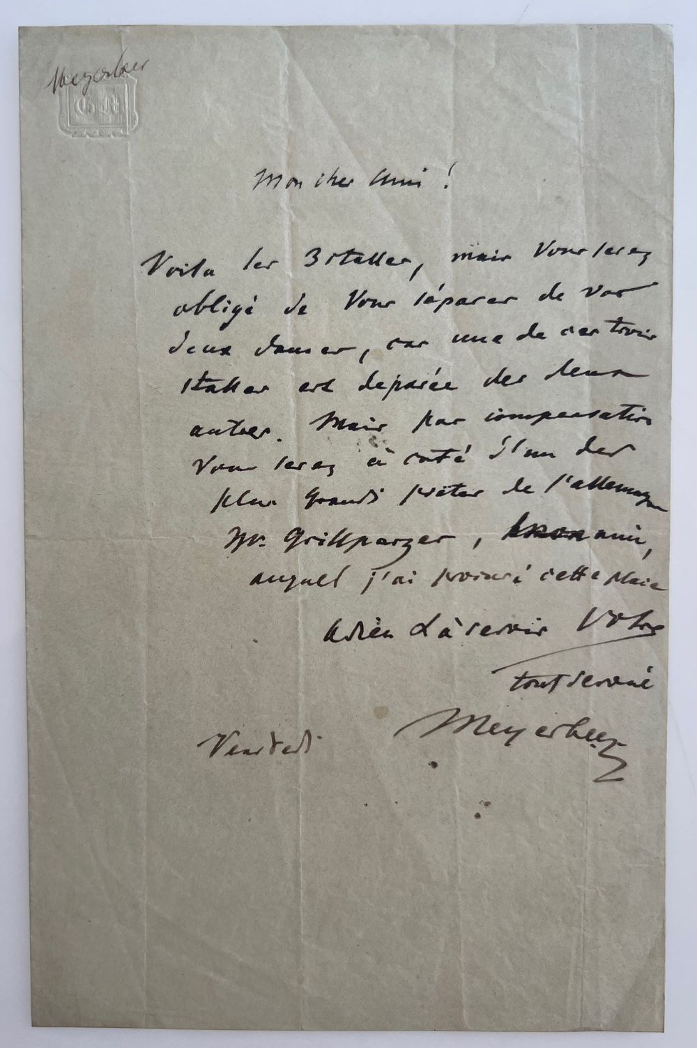 Written to a friend to whom he sends 3 "stalles" (place cards). Since only two of the three places were together, the friend unfortunately had to leave the two ladies in his company. In exchange, he would have the pleasure of spending the evening next to the German writer Franz Grillparzer. - Grillparzer stayed in Paris for three months in the spring of 1836 and made the acquaintance of Meyerbeer. -