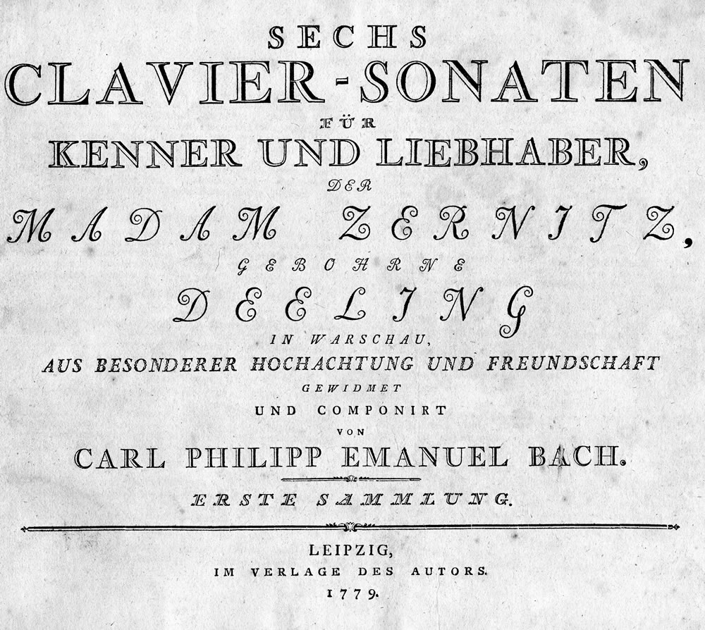 Erstausgabe der Sammlung aller sechs Klaviersonaten "für Kenner und Liebhaber" in Typendruck. Äußerst selten in dieser Vollständigkeit. - Der zweitälteste Sohn J. S. Bachs (1714-1788) lebte viele Jahre als Cembalo-Virtuose Friedrichs des Großen am Berliner Hof und später als Kantor und Musikdirektor in Hamburg, wo auch die Sonaten entstanden sind. Sein Einfluß auf die Entwicklung des Klavierstils ist nicht hoch genug einzuschätzen, seine Verdienste um das Musikleben seiner Zeit enorm. Dementsprechend besaß er bereits zu Lebzeiten eine herausragende Stellung bei seinen Zeitgenossen, wie das Pränumeranten-Verzeichnis der Sonaten zeigt (u. a. Burney, Kirnberger, Marpurg, Schubart und Türk). - Die einzelnen Hefte, jeweils in Typendruck, wurden in der Breitkopfischen Offizin hergestellt. Die Sammlungen 1-3 liegen in der Ausgabe mit Diskantschlüssel (statt Violinschlüssel) vor. Beide Ausgaben sind gleichzeitig erschienen. - Hoboken 190, 192, 195, 196, 198, 201; RISM B 85, 87, 88, 90, 91, 93; Helm S. 262 f.