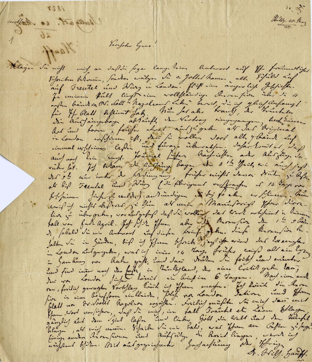 Ausführlicher, inhaltsreicher Brief an den Verleger Friedrich Brockhaus in Leipzig bei dem Hauff sich für seine bisher nicht gelieferte Rezension von Walter Scotts "Leben Napoleons Bonapartes" für die "Blätter für literarische Unterhaltung" rechtfertigt. Bockhaus hatte ihn im Januar und Februar bereits um die Zusendung der angebotenen Rezension gebeten: