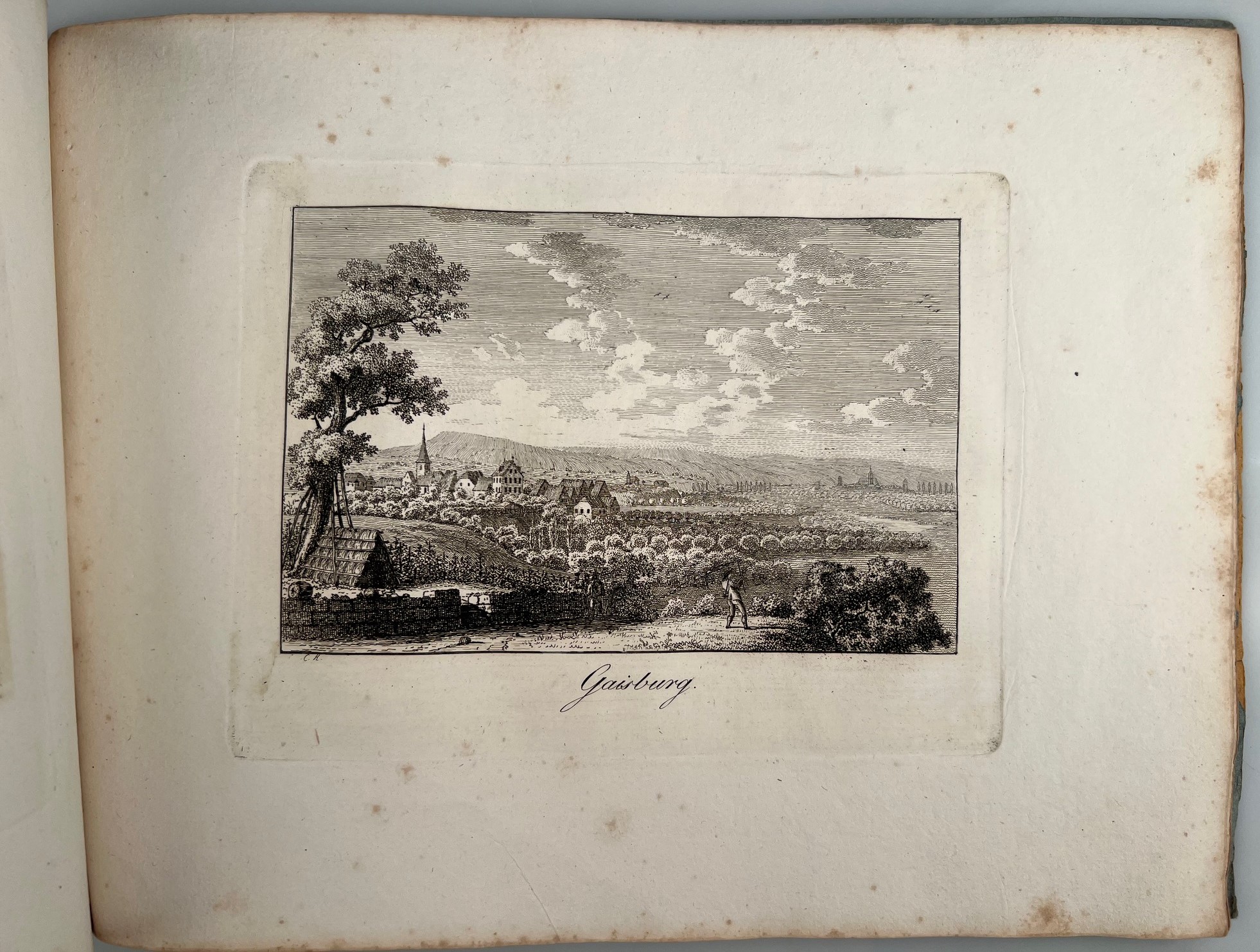 Sehr seltenes und wohlerhaltenes Album mit 14 Radierungen von Carl Urban Keller (1772-1844), praktizierender Jurist, Maler und Zeichner in Stuttgart. Frühwerk des späteren Mitbegründers des Württembergischen Kunstvereins, der ab 1798 auf seinen Ausflügen in seiner schwäbischen Heimat zahlreiche Ansichten von hohem dokumentarischem Wert anfertigte. "Diese kleine Sammlung mahlerischer Ansichten von Stuttgart und seinen Umgebungen verdient um so mehr eine freundliche Aufnahme, da es bisher gänzlich an einem ähnlichen Institute fehlte. Zwar sind seit einigen Jahren ein paar grössere Ansichten von Stuttgart herausgekommen, aber noch niemals war diese Stadt so von allen Seiten dargestellt..." (Rezension in der Jen. ALZ 1804, Sp. 416). - Der Verlagsname und Preis wurden von alter Hand auf dem Titelblatt ergänzt.