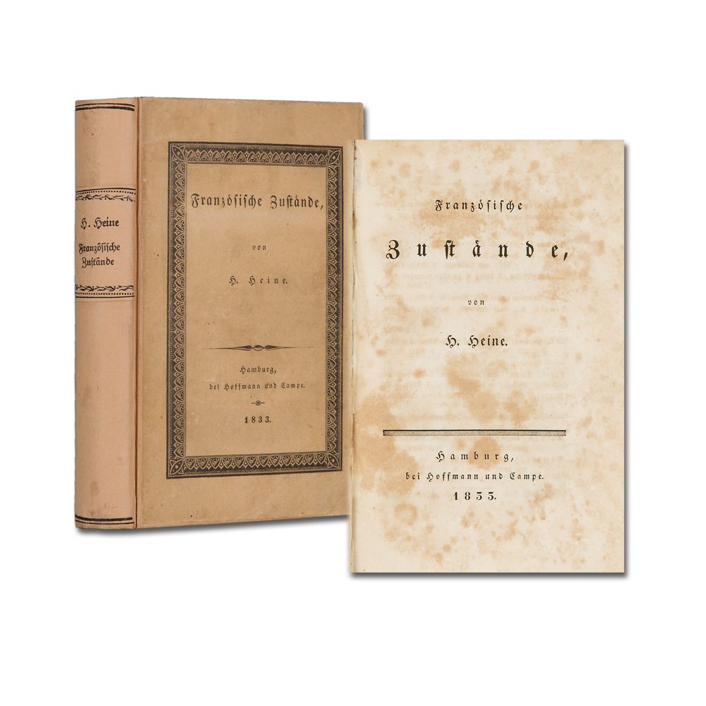 Erste deutsche Ausgabe von Heines erstem rein politischem Werk, mit der verstümmelten Vorrede. Es erschien im gleichen Jahr wie die französische Erstausgabe und zählt zu den wichtigsten seiner mittleren Schaffensperiode. Heine war nach Paris gegangen, um von dort Berichte über das kulturelle und politische Leben in der französ. Hauptstadt zu schreiben, die er dann seit Ende 1831 in Cottas Augsburger "Allgemeiner Zeitung" erscheinen ließ. Diese Artikel erregten in Wien derartiges Aufsehen, daß F. v. Gentz im Auftrag Metternichs die Einstellung der Serie erreichte. Mit dem 9. Juni brachen die Aufsätze ab. Daraufhin veröffentlichte Heine noch im gleichen Jahr die Korrespondenz geschlossen in Buchform. Dieser Buchausgabe ist noch ein 9. Bericht hinzugefügt, der bereits fertiggestellt war, aber aufgrund des Verbotes nicht mehr erscheinen durfte. Die Auslieferung des Bandes begann im Dez. 32 mit dem vordatierten Titel 1833 und den unzensierten Artikeln. Im Februar 1833 wurde das Werk in Preußen verboten. - Aufgrund der schlechten Verkaufszahlen der Buchausgabe - in 20 Jahren ca. 1000 Exemplare - wurde eine 2. Auflage nicht erforderlich. - Wilhelm-Galley I, 581; Houben I, S. 395 f.