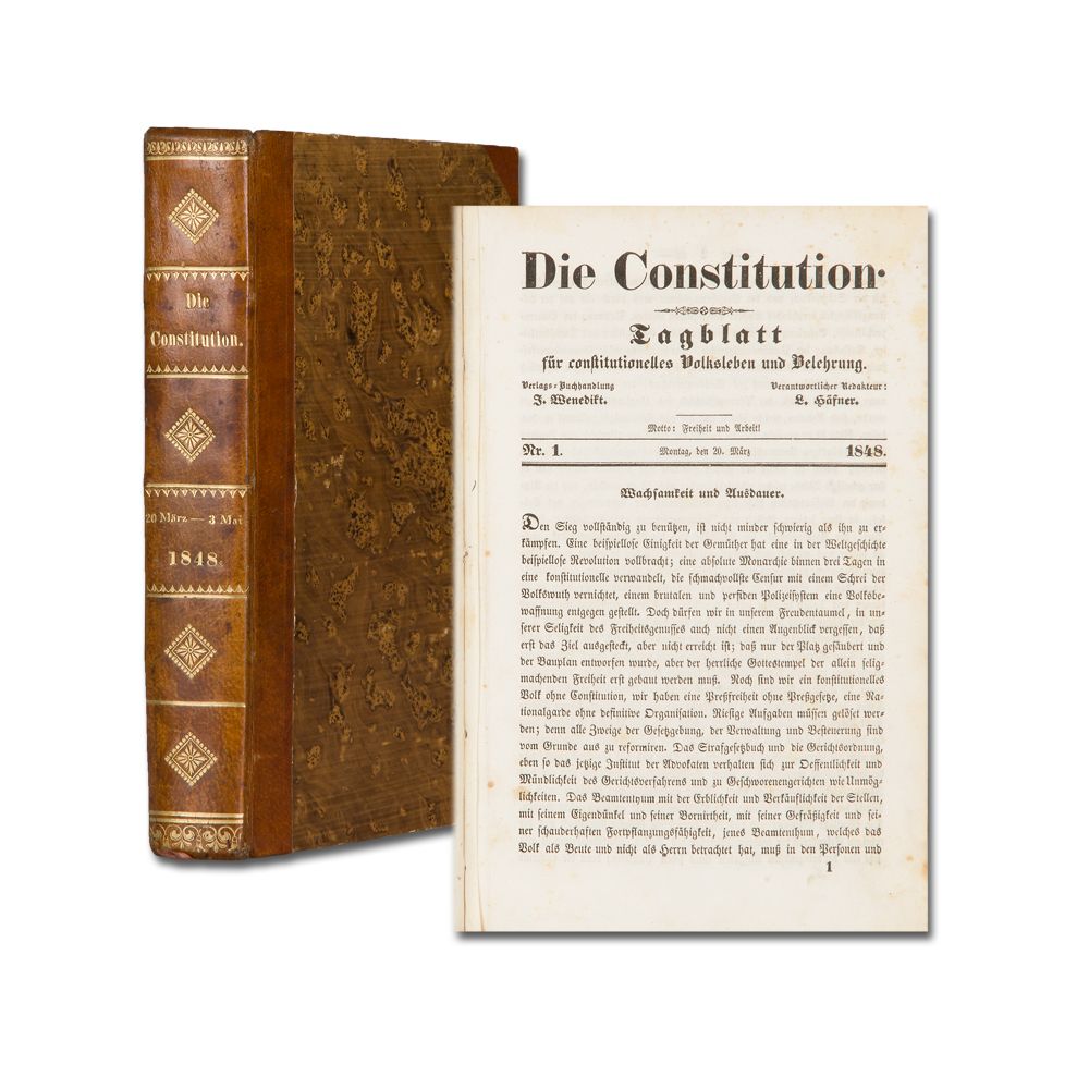DIE CONSTITUTION. Tagblatt für constitutionelles Volksleben und Belehrung. Nr. 1-36 [von 178]. Herausgegeben von L. Häfner. Wien, J. Wenedikt 1848. 582 [recte 584] S., teils stockfleckig. Halblederband der Zeit mit reicher ornamentaler Rückenvergoldung.