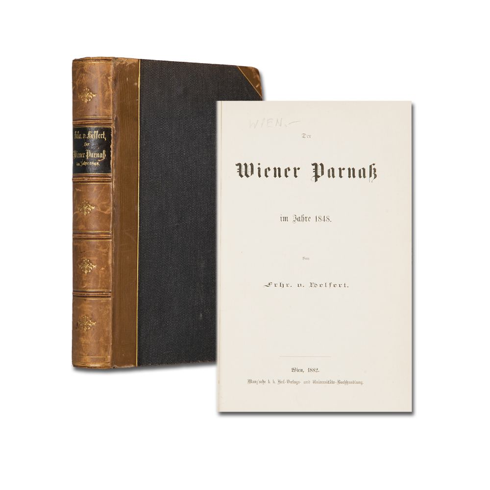 HELFERT, [J. A.] Frhr. v.: Der Wiener Parnaß im Jahre 1848. Wien, Manz 1882 1 Bl., XCIII, 463 S. Handschriftlicher Eintrag im Vorsatz. Buchblock gelockert. Halblederband der Zeit.