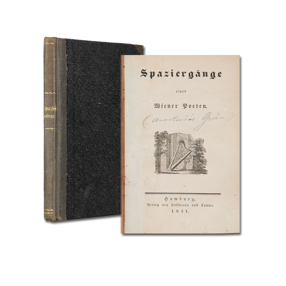 [GRÜN, A.][Pseud. für A. A. v. AUERSPERG]: Spaziergänge eines Wiener Poeten. Hamburg, Hoffmann und Campe 1831. VIII, 106 S. mit Titelvignette. Stellenweise wasserfleckig. 1 Bl. mit altem Namen. Halbleinenband der Zeit.