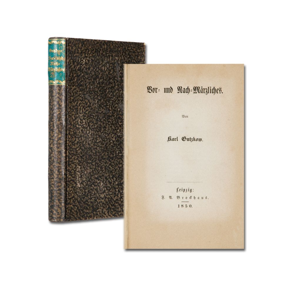 Erstausgabe der Sammlung vorwiegend von Theaterschriften; Band 4 der 'Vermischten Schriften'. Hervorzuheben ist die "Ansprache an die Berliner im März 1848", die damals anonym erschienen war. - Borst 2391; Goedeke III 925, 51, 4; Houben, Gutzkow-Funde 551.