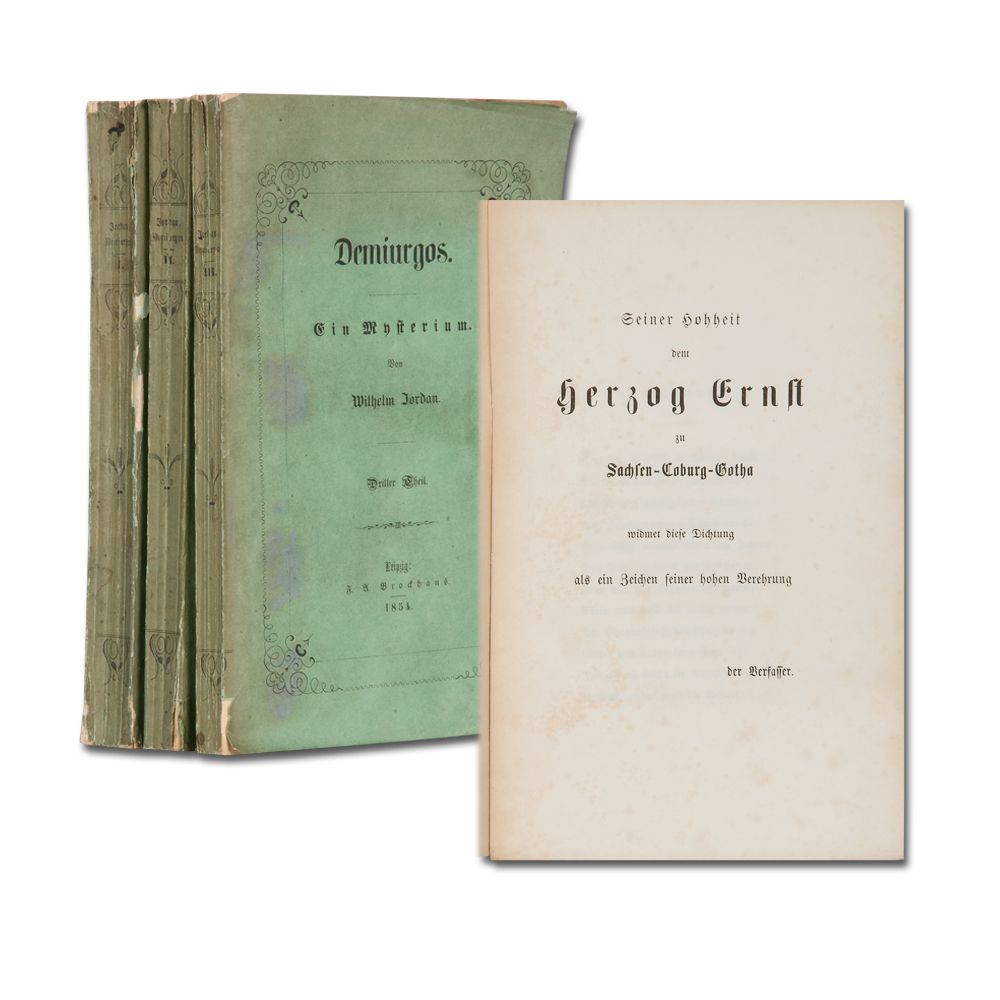 Originalausgabe. - Der 1. Teil erschien anonym bereits 1852 und wurde 1854 mit dem neuen Titel ausgegeben. Jordan war zwischen 1848 und 1849 Mitglied des Frankfurter Parlaments und zählte zu dessen wirksamsten Rednern. "Demiurgos" ist zwar erst später erschienen, spiegelt aber die Ideen und Erfahrungen aus der Parlamentszeit wider. Das dem "Faust" nachempfundene Werk will "die Verschmelzung von Weltanschauungsdichtung im Sinne des Idealismus und neuen Entwicklungsglaubens sowie der Dogmatik des ewigen Fortschritts" erreichen und nimmt dabei manche Thesen Darwins und des Darwinismus vorweg (Alker). - Borst 2538.