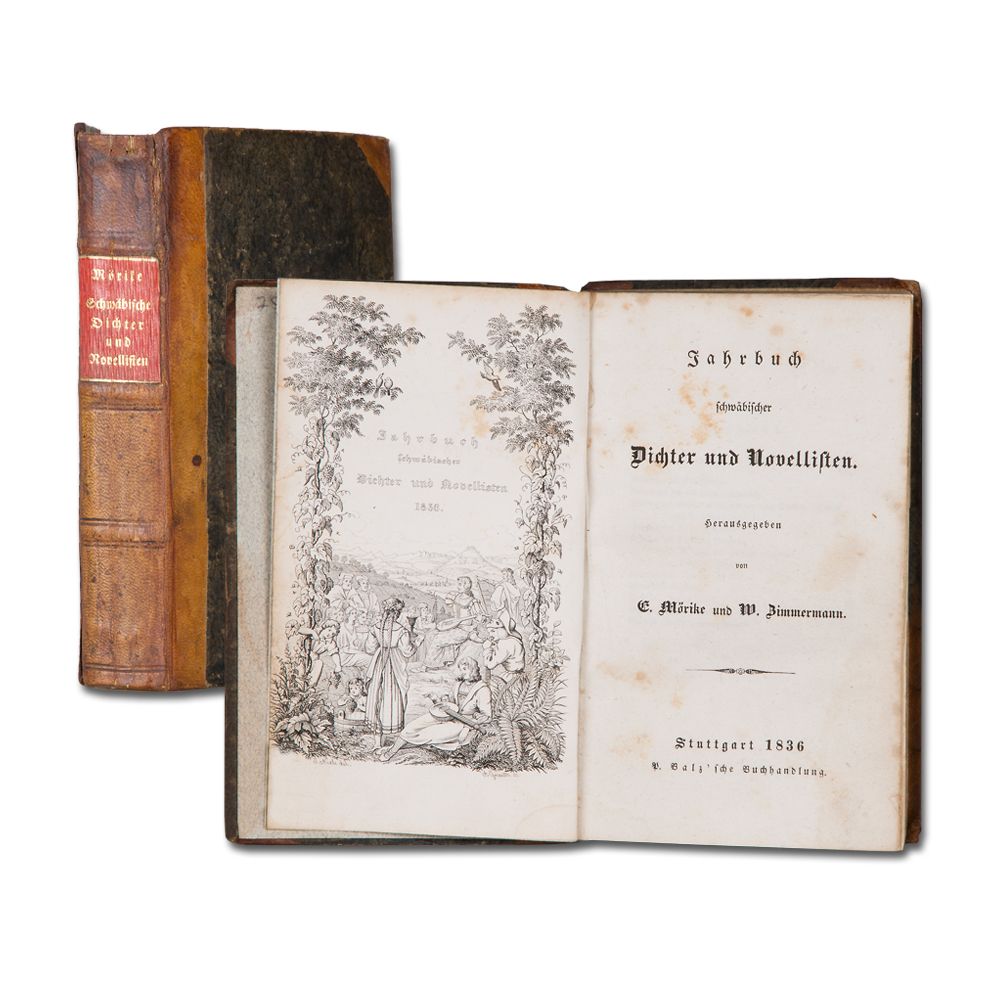 Sehr seltenes Jahrbuch mit 3 Erstdrucken von Mörike; die Gedichte "Das Bacchusfest" und "Erstes Liebeslied eines Mädchens" und das Märchen "Der Schatz". Der Band enthält außerdem Gedichte von L. Bauer, K. Mayer und F. Th. Vischer unter dem Pseudonym A. Treuberg.- Sammlung Kauffmann Nr. 73; Marbach-Katalog Nr. 282.