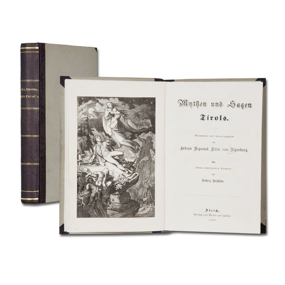 ALPENBURG, J. N. Ritter v. [Pseud. f.: J. N. Mahl-Schedl] [Hrsg.]: Mythen und Sagen Tirols. Gesammelt und herausgegeben. Mit einem einleitenden Vorwort von L. Bechstein. Zürich Meyer und Zeller 1857 Holzschnitt als Frontispiz. XII, 432 S. Handschriftlicher Eintrag im Vorsatz. Exlibris.Druckfrische Ausgabe. Halbleinenband der Zeit