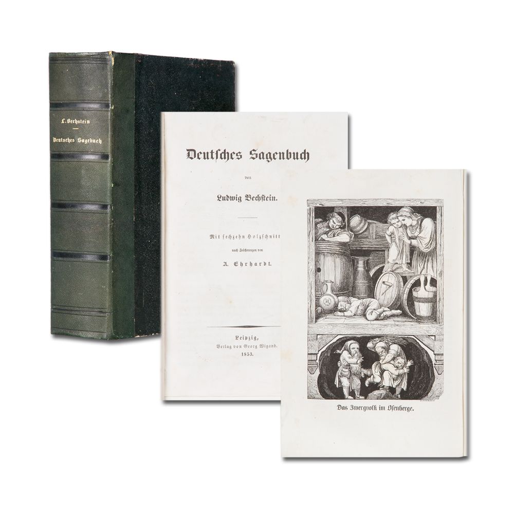 Erstausgabe des, neben der Grimmschen Edition, bedeutendsten deutschen Sagenbuches. Die umfangreiche und verdienstvolle Sammlung enthält 1000 Sagen, für deren Nacherzählung und Bearbeitung Bechstein die "Form einer idealen Sagenwanderung" wählt. Über die Quellen und Auswahlprinzipien gibt er in seinem Vorwort Rechenschaft. "Dieses Sagenbuch soll im besten Sinne ein Volksbuch sein". Ausdrücklich der Jugend zugedacht hat Bechstein damit das erste nennenswerte überregionale Werk deutscher Volkssagen als Jugendliteratur geschaffen. "Seine volkskundlichen Sammlungen sind durch die Fülle des Materials heute noch von höchstem Wert" (K. Goedeke). - Linschmann 423; Goedeke XIII, 170,71; Rümann 357; Seebass 144.