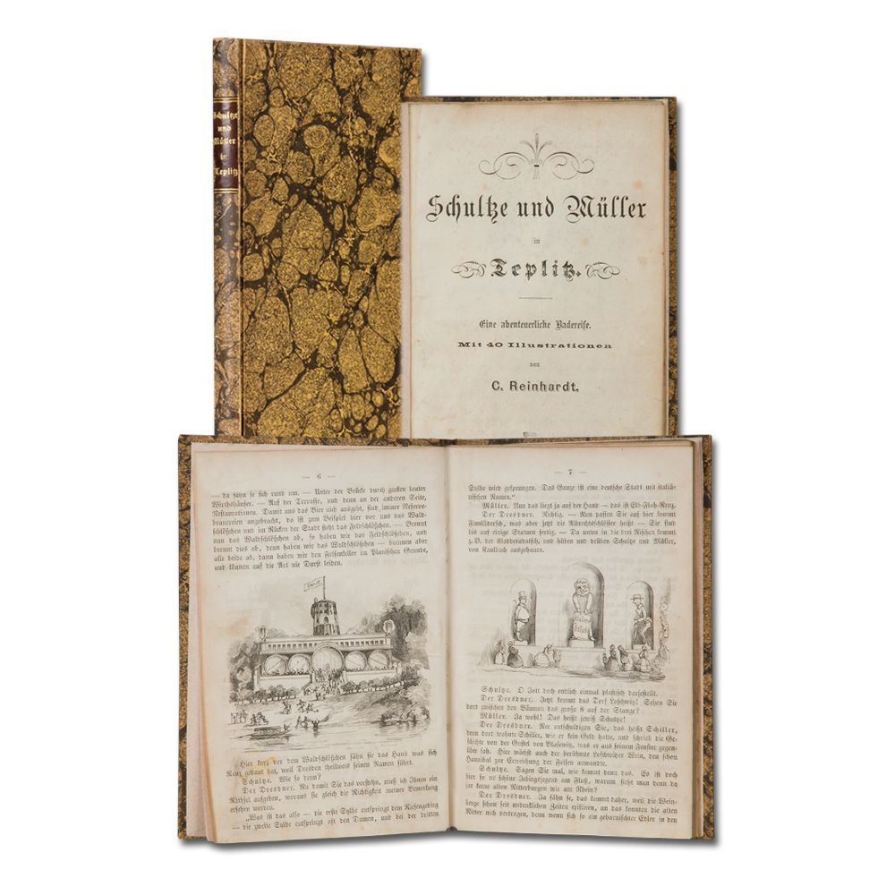 [KALISCH, D. Hrsg.]: Schultze und Müller in Teplitz. Eine abenteuerliche Badereise. Berlin A. Hofmann 1859 89 S., 3 Bl. Anzeigen, 40 Textholzschnitte von Carl Reinhardt. Stock- und fingerfleckig. Pappband im Stil der Zeit