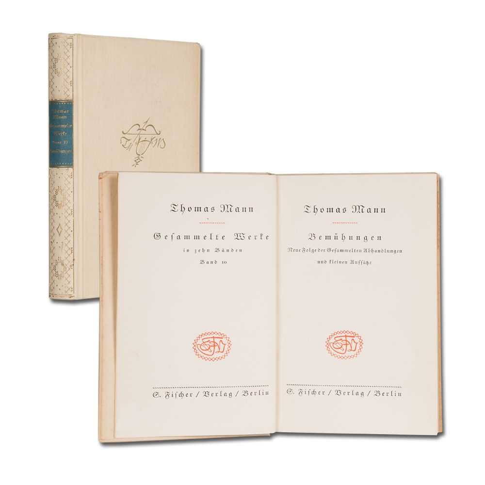 MANN, Th.: Bemühungen. Neue Folge der Gesammelten Abhandlungen und kleinen Aufsätze. Berlin S. Fischer 1925 339 S., 3 Bl., 1 w.Bl. Vorsatz und erstes Blatt mit kl. Feuchtigkeitsspur. OLn.
