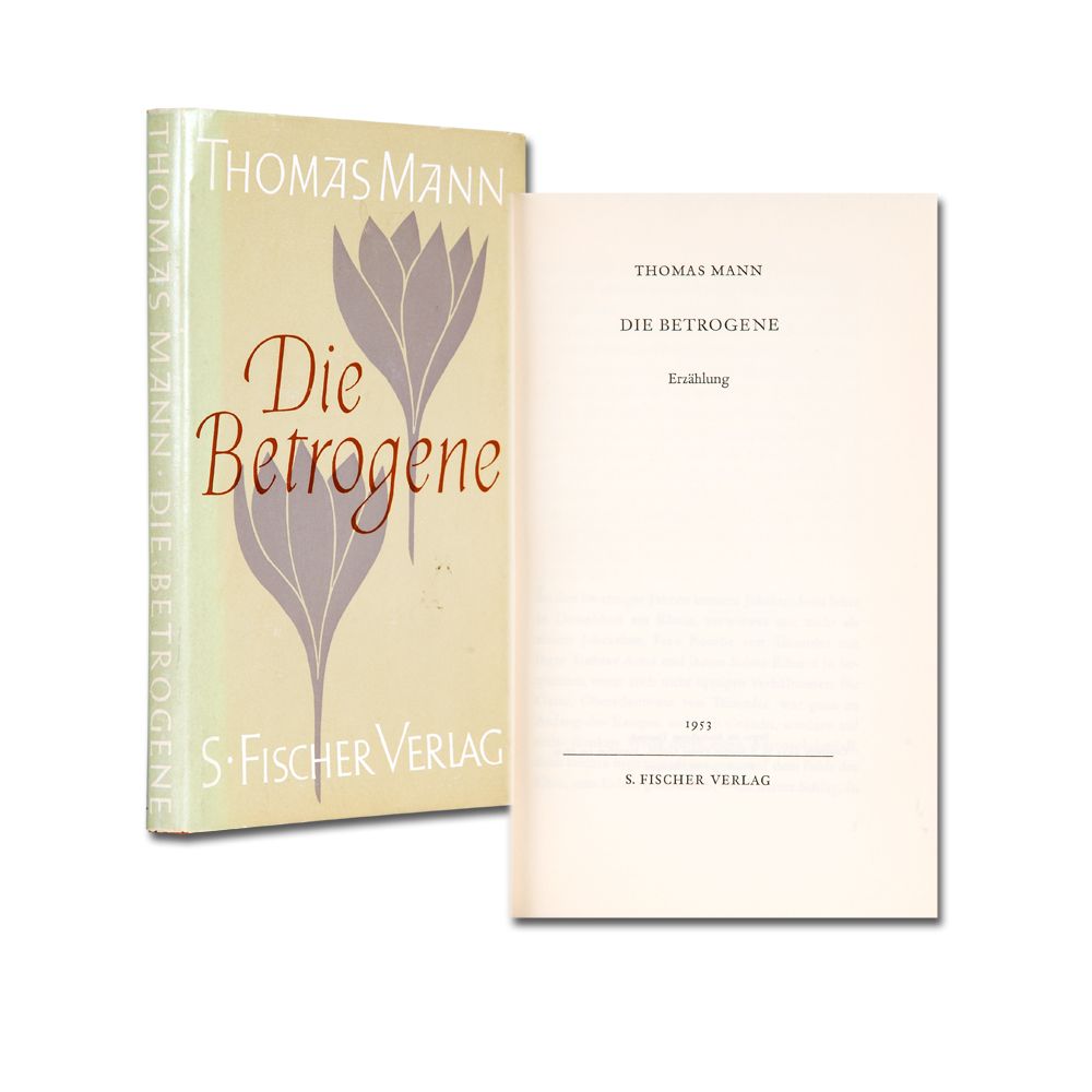 MANN, Th.: Die Betrogene. Erzählung. 1.-15. Tsd. (Frankfurt/M.) S. Fischer 1953 126 S., 1 Bl. Roter Original-Leinenband mit goldgepr. Rückentitel und illustr. Original-Umschlag von Martin Kausche.
