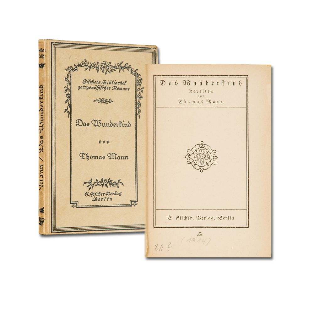 MANN, Th.: Das Wunderkind. Novellen. Berlin S. Fischer (1914) 117 S., 1 Bl. (Anzeigen). OBroschur. (Fischers Bibliothek zeitgenössischer Romane, 6. Reihe).