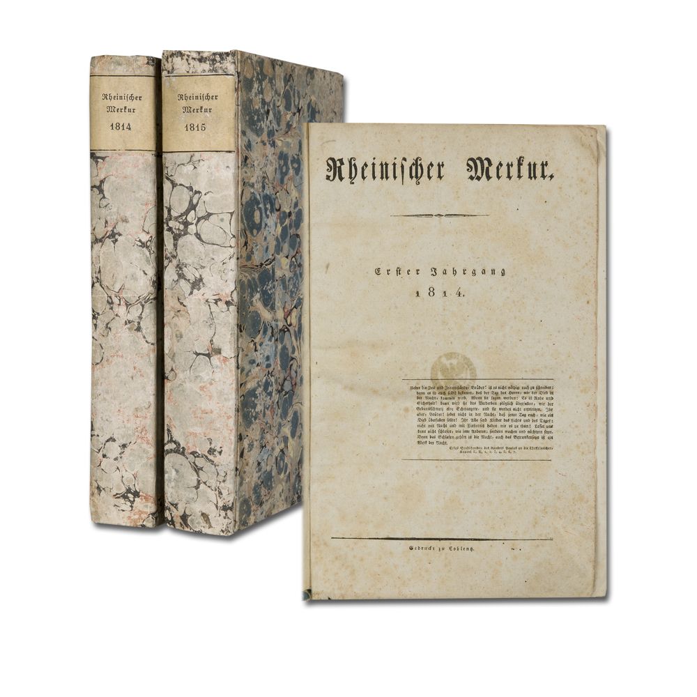 RHEINISCHER MERKUR: [Herausgegeben von J. Görres]. Erster (- dritter) Jahrgang in 2 Bänden. Nr. 1-357 (à 2 Bl.), 24 Beilagen und 7 Extrablätter, 2 Haupttitel [alles Erschienene]. Koblenz Pauli und (ab Nr. 277) Heriot 1814-16. Folio. Ohne das Porträt. Haupttitel verso mit kleinem Stempel. Gut erhaltenes Exemplar, wenig stockfleckig. Pappbände der Zeit.