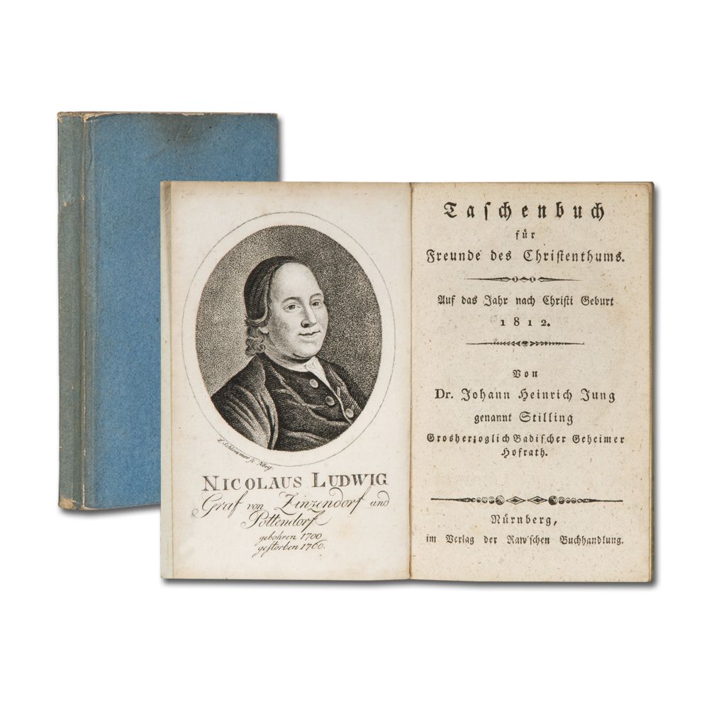TASCHENBUCH für Freunde des Christentums. Auf das Jahr nach Christi Geburt 1812. [Hrsg.] Von J. H. Jung Stilling. Nürnberg Raw Duodez. Gestochenes Frontispiz Nicolaus Ludwig Graf von Zinzendorf von L. Schlemmer. 176 S. Pappband der Zeit.