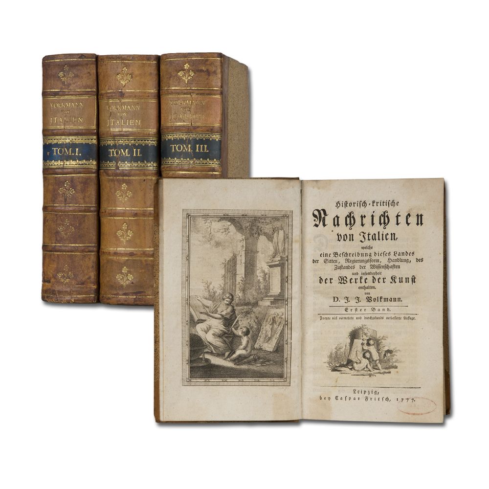 VOLKMANN, J. J.: Historisch-kritische Nachrichten von Italien, welche die Beschreibung dieses Landes der Sitten, Regierungsform, Handlung, des Zustandes der Wissenschaft und insonderheit der Werke der Kunst enthalten. Zweyte, viel vermehrte und durchgehends verbesserte Auflage. 3 Bände. Leipzig, C. Fritsch 1777-78. Gestochenes Frontispiz von Geyser, XXXVI, 808 S.; VIII, 943 S., 5 Bl., 922 S., 28 Bl. (Register), 3 gestochene Titelvignetten. Titel verso gestempelt. Breitrandiges Exemplar. Schöne Halblederbände der Zeit mit fleuraler Rückenvergoldung. Rückenschilder mit leichten Gebrauchsspuren.