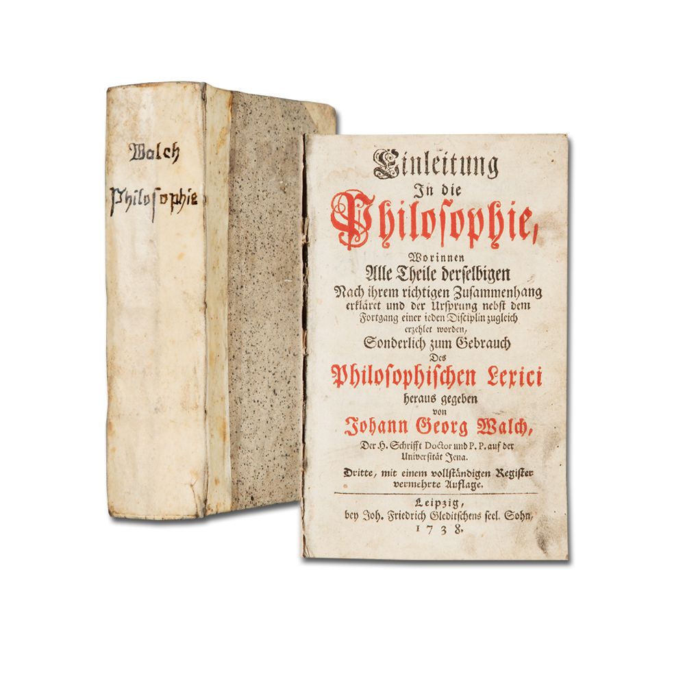 WALCH, J. G.: Einleitung In die Philosophie, Worinnen Alle Theile derselbigen Nach ihrem richtigen Zusammenhang erklärt und der Ursprung nebst dem Fortgang einer ieden Disciplin zugleich erzehlet worden, Sonderlich zum Gebrauch Des Philosophischen Lexici herausgegeben. Dritte, mit einem vollständigen Register vermehrte Auflage. Leipzig J. F. Gleditsch 1738 16 Bl., 750 S., 17 Bl. Titel in Rot und Schwarz. Gebräunt, unterer Rand feuchtigkeitsfleckig, im vorderen Deckel zeitgenössischer Eintrag. Halbpergament der Zeit.