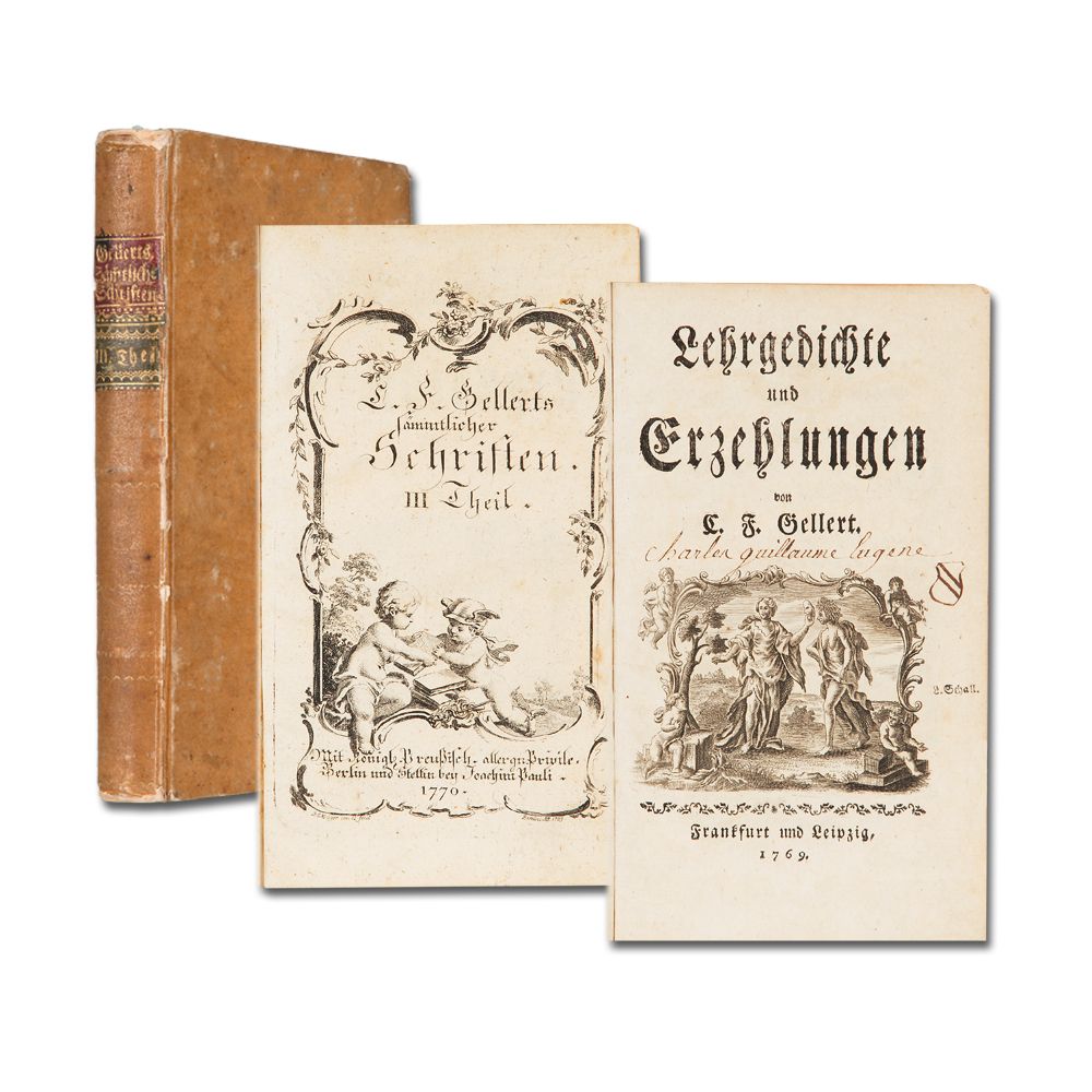 GELLERT, C. F.: Lehrgedichte und Erzehlungen. Berlin und Stettin J. Pauli 1770 Kupfertitel von F. C. Krüger, 234 S., 1 Bl. 1 Kupfervignette und 1 Holzschnittvignette im Text. Pappband der Zeit mit 2 farbigen Rückenschildern. (Sämmtliche Schriften 3. Theil)