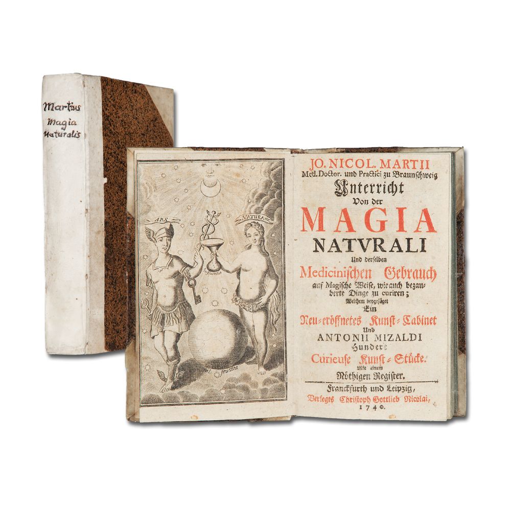 MARTIUS, J. N.: Unterricht Von der Magia Naturali Und derselben Medicinischen Gebrauch auf Magische Weise, wie auch bezauberte Dinge zu curieren; Welchem beygefüget Ein Neu=eröffnetes Kunst=Cabinett Und A. Mizaldi 100 Curieuse Kunst=Stücke. Mit einem Nöthigen Register. Frankfurt und Leipzig, C. G. Nicolai 1740. Frontispiz mit allegorischer Darstellung in Kupferstich. 7 Bl., 296 S., 11 Bl. Titel in Rot und Schwarz. Halbpergamentband der Zeit.