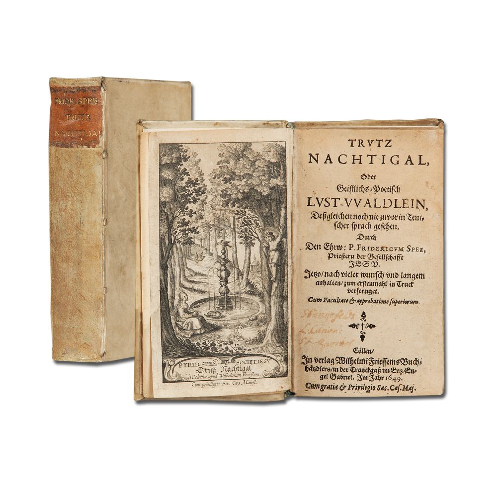 SPEE, F. v.: Trvtz Nachtigal, Oder Geistlichs=Poetisch Lvst-Waldlein, Deßgleichen noch nie zuvor in Teutscher sprach gesehen. Jetzo/ ... / zum erstenmahl in Truck verfertiget. Köln W. Friessem 1649 Duodez. Kupfertitel, 7 Bl., S. 1-341 (Text), 3 S. (Register und Errata), 24 gestochene Notentafeln. Rückseite des letzten Notenblattes und 1 weißes Bl. mit Eintragungen von alter Hand. Titel mit altem Besitzeintrag. Teils mit An- und Unterstreichungen mit Rot- bzw. (überwiegend) Bleistift. Einige Blatt knapp beschnitten. Notentafeln im Außensteg geringfügig angeschnitten mit leichtem Notenverlust. Letztes (weißes) Bl. im unteren Falz angerändert. Leicht gebräunt. Pergamentband der Zeit. Neu aufgebunden, vorderes Gelenk teils gebrochen. Leicht berieben.
