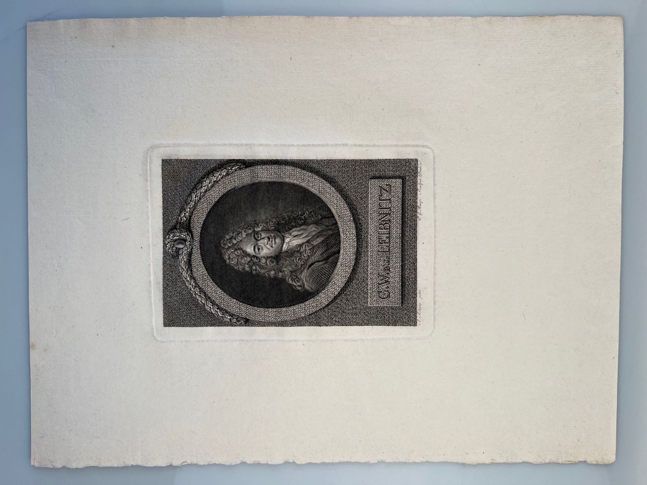 LEIBNIZ, Gottfried Wilhelm. - Portrait. Porträt. Brustbild nach rechts mit üppiger Lockenperücke. Hintergrund in einem Medaillonrahmen, geschmückt mit einer Blattgirlande. Kupferstich von K.G. Rasp nach einem Gemälde von A. Scheits. ca. 1780 18,3 x 12,45 cm. Schöner kräftiger und sehr breitrandiger Abzug in hervorragendem Zustand.