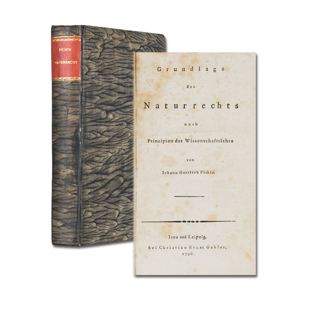 FICHTE, J. G.: Grundlage des Naturrechts nach Principien der Wissenschaftslehre. 2 Theile in 1 Band. Jena und Leipzig C. E. Gabler 1796-97. 12 Bl., 229 S.; 1 Bl., 269 S. Teils stockfleckig. Vorsatz gestempelt. Pappband der Zeit.