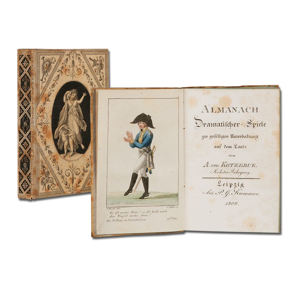 ALMANACH Dramatischer Spiele zur geselligen Unterhaltung auf dem Lande. [Herausgegeben] von A. v. Kotzebue. Sechster Jahrgang. Leipzig P. G. Kummer 1808 Duodez. Gestochener Titel, 333 S., 1 Bl., 6 kolorierte Kupfer. 1 Bl. gestempelt. Einge Blatt etwas braunfleckig. Illustrierter Original-Pappband.